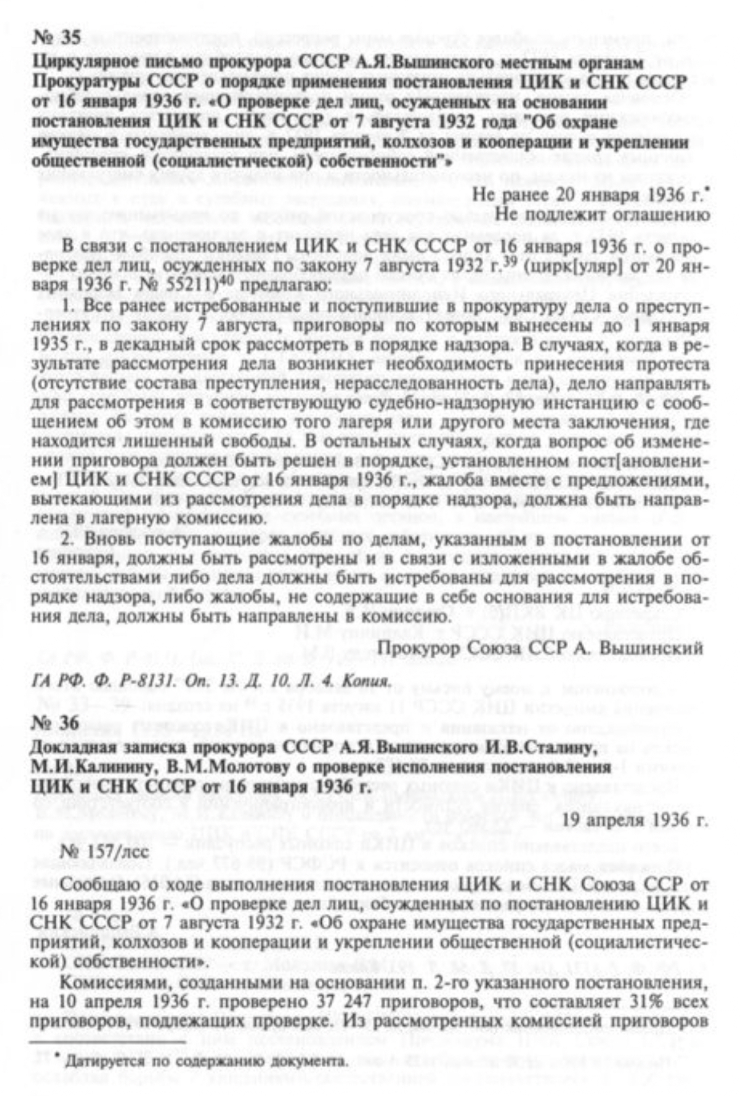 Циркулярное письмо прокурора СССР А. Я. Вышинского местным органам Прокуратуры СССР о порядке применения постановления ЦИК и СНК СССР от 16 января 1936 г. «О проверке дел лиц, осужденных на основании постановления ЦИК и СНК СССР от 7 августа 1932
