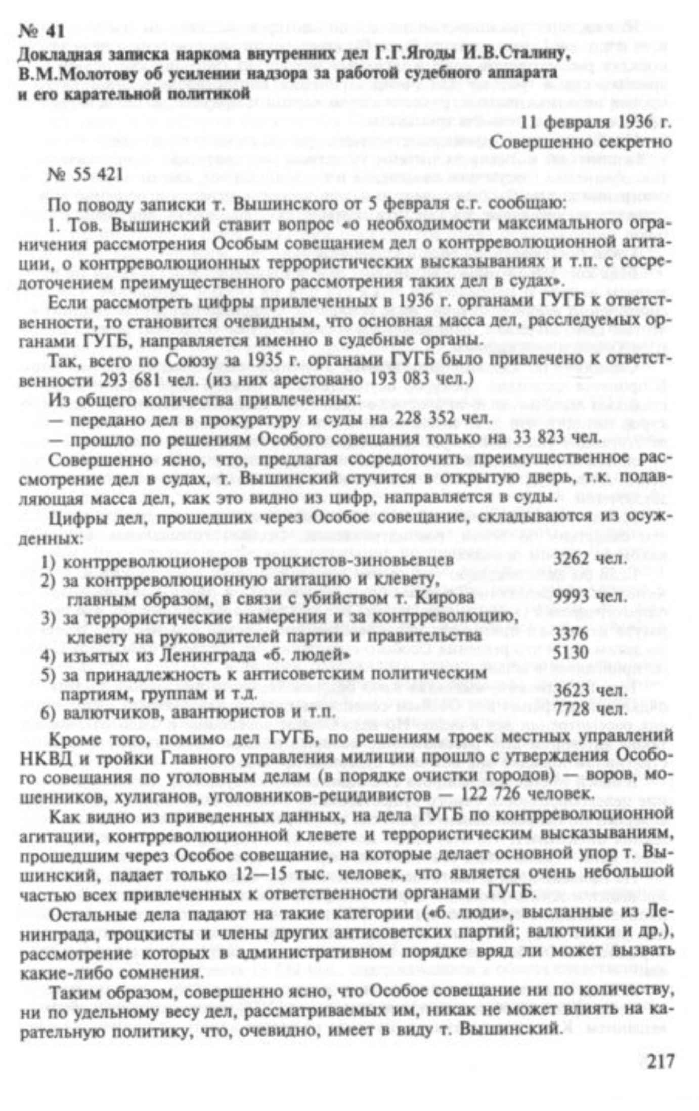 Ягода утверждает, что «основная масса дел, расследуемых органами ГУГБ, направляется именно в судебные органы», и приводит цифры, согласно которым за 1935 год из порядка 230 тысяч привлеченных только 30 с небольшим тысяч дел прошли через ОСО. Причем, любопытная деталь, Ягода сообщает, что «всего по Союзу за 1935 г. органами ГУГБ было привлечено к ответственности 293 681 чел. (из них арестовано 193 083 чел.)».