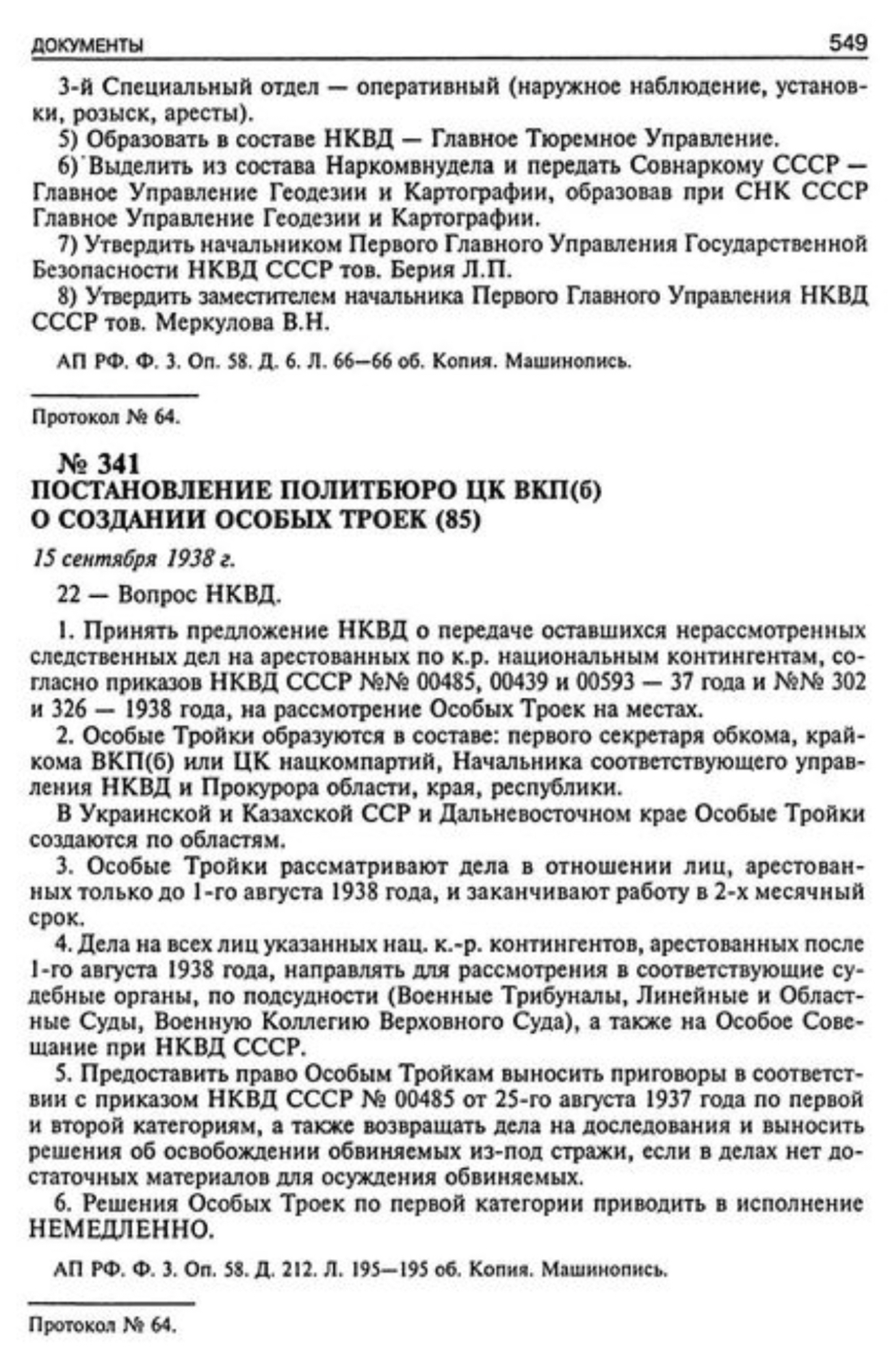 Как мы видим, «тройками» Ягода называет некие органы местных управлений НКВД. И следующий руководитель НКВД Ежов в своем приказе говорит о «республиканских, краевых и областных тройках», то есть речь идет тоже о местных органах.