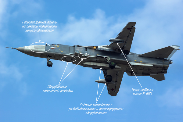 На платформе бомбардировщика Су-24М в числе прочих был построен тактический разведчик Су-24МР. Если приглядеться, то можно заметить, что он разительно отличается от исходного бомбера: