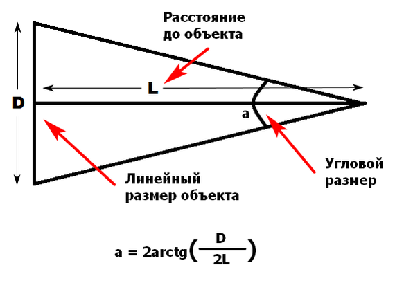 Ну раз уж речь зашла об угловых размерах, то надо упомянуть что это такое. Лучше всего, на мой взгляд, это показывает картинка типа этой: