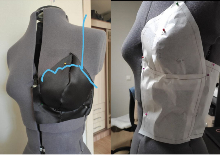 Те самые первые построения. Задняя половинка, потому что выкройка передней выглядела, как франкенштрудель :( Зато гульфик получился.