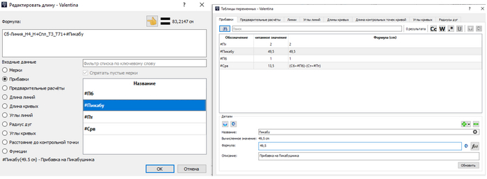 Плюс программы в том, что длину и другие параметры линий можно задавать параметрически – используя введенные мерки, длины других линий, прибавки и тд (примеры интерфейса на фото).