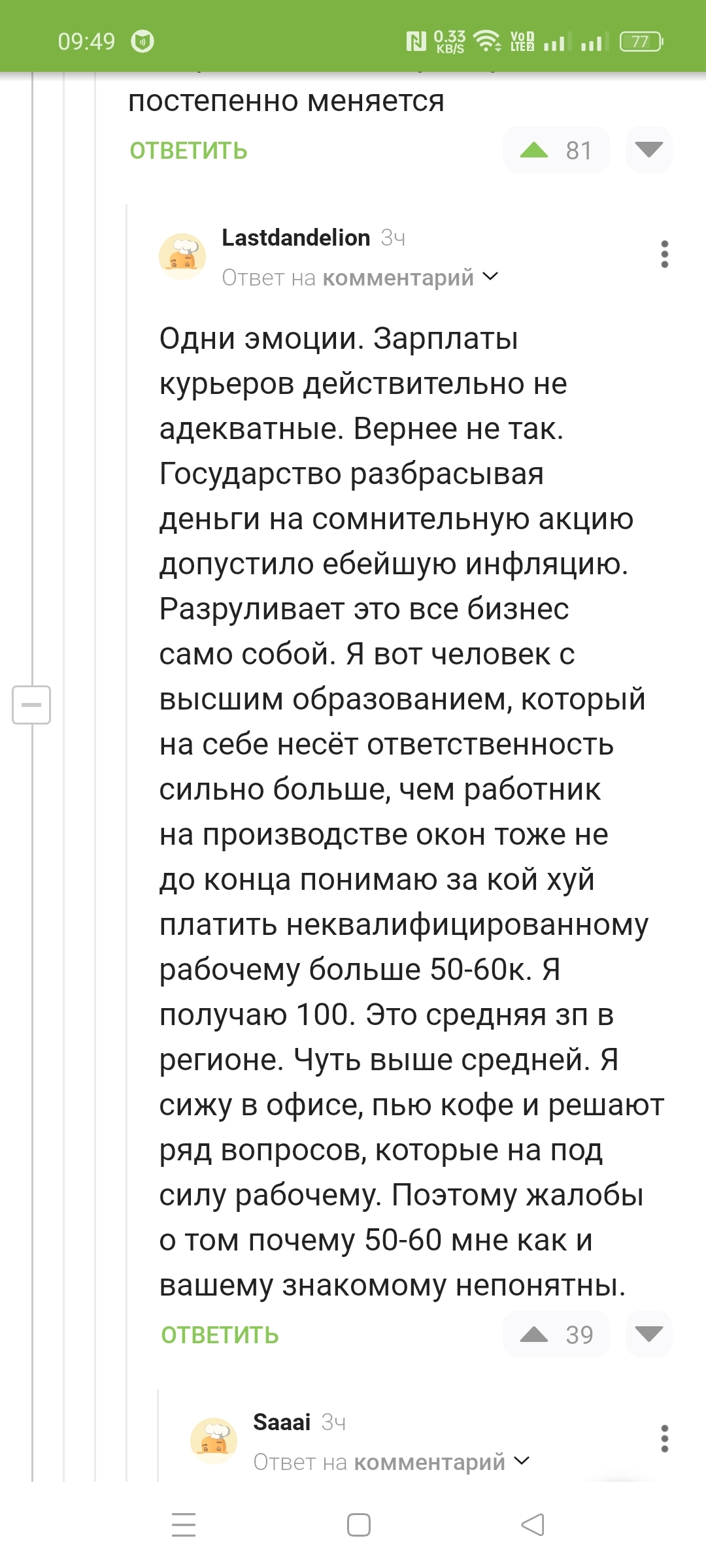 Вчера разговаривал с владельцем фирмы по производству стеклопакетов для пластиковых окон. Он жаловался как тяжело найти работников на производство с зарплатой "аж 50-60 тысяч". Не идут, а если идут то не задерживаются. Те, кто задержались периодически бухают и забивают на работу. Но из не увольняют - заменить не кем. А виной всему, по его словам "неадекватные зарплаты курьеров и таксистов". Кстати периодически встречаю такое мнение и в реале и в интернете. Так вот: это не у курьеров зарплаты неадекватно высокие, это в других местах они неадекватно низкие.