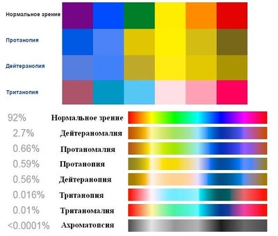 Впоследствии все оказалось еще веселее, т.к. выяснилось, что и моя сестра — тоже дальтоник. На вопрос о том, как она умудрилась заниматься живописью в институте, она сказала, что просто запомнила, где какие краски у нее в палитре, а когда рисунок был с натуры, то она постоянно спрашивала свою подругу о том, какой там или тут цвет.