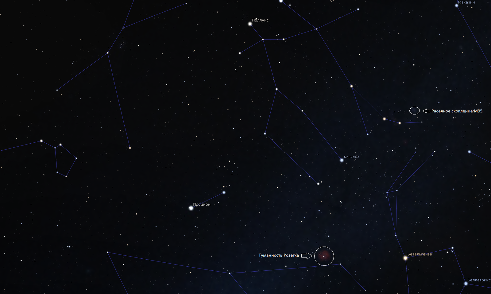 Положение рассеянного скопления М35 и туманности Розетка (NGC 2237).