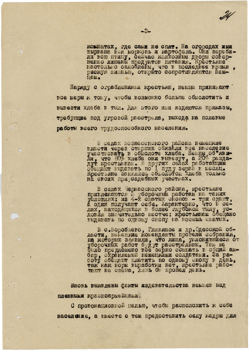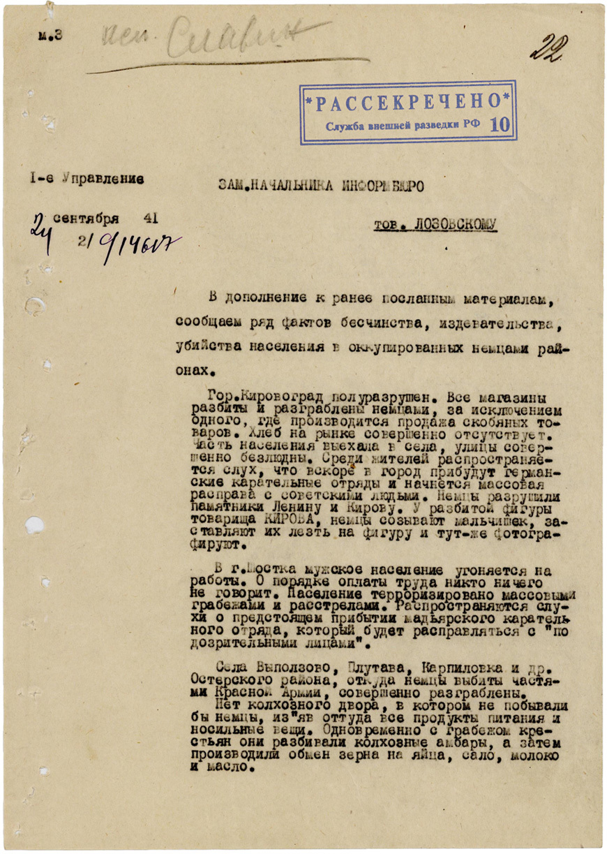 Сообщение начальника 1-го Управления НКВД СССР П.М. Фитина зам. начальника Совинформбюро С.А. Лозовскому о зверствах нацистов на оккупированной территории. 24 сентября 1941 г.