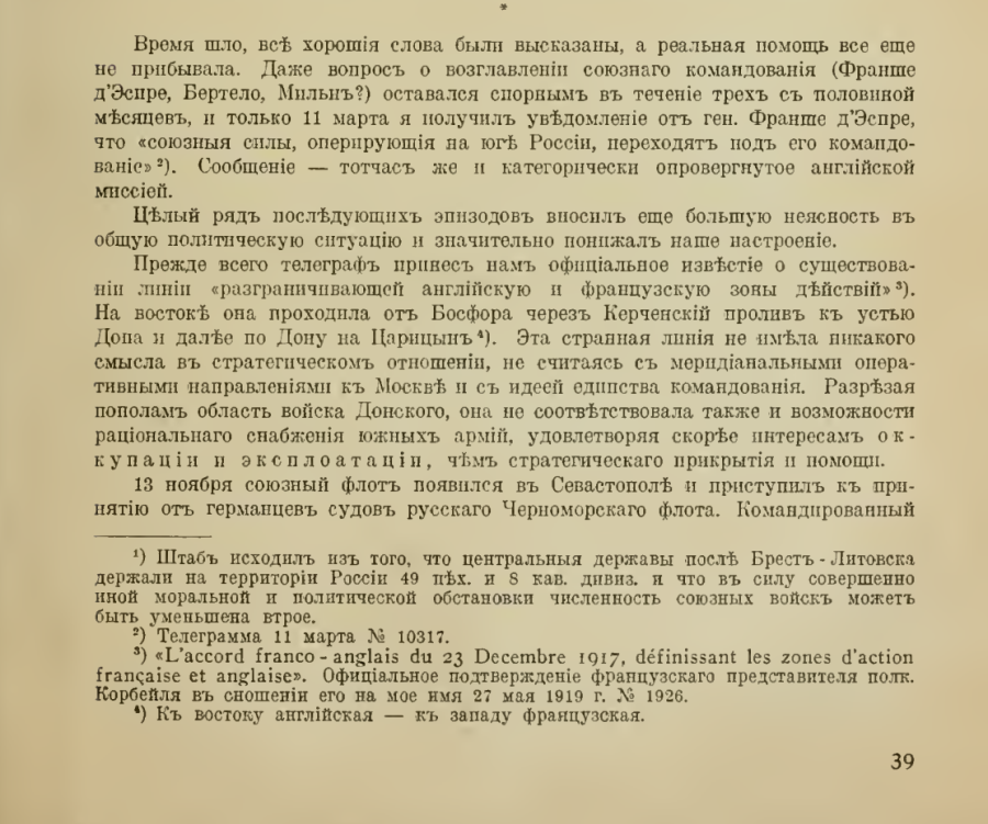 "Время шло, все хорошие слова были высказаны, а реальная помощь всё еще не прибывала. Даже вопрос о возглавлении союзного командования (Франше д’Эспре, Бертело, Мильн?) оставался спорным в течение трёх с половиной месяцев, и только 11 марта я получил уведомление от ген. Франше д’Эспре, что «союзные силы, оперирующие на юге России, переходят под его командование». Сообщение - тотчас же и категорически опровергнуто английской миссией.