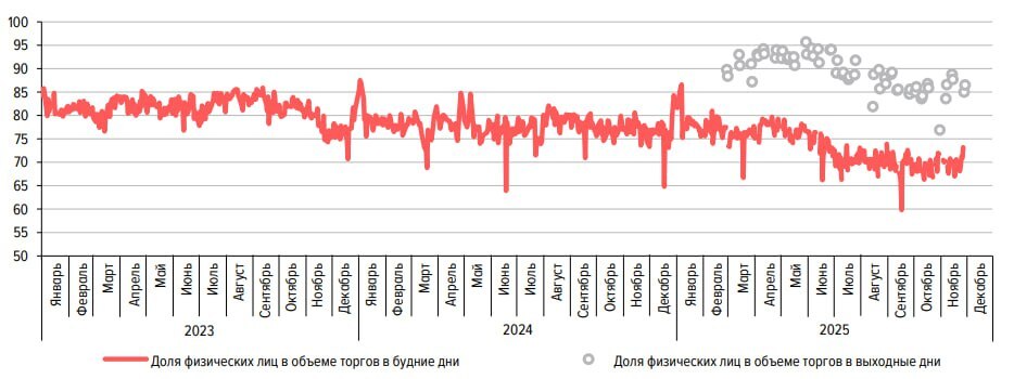 Применение санкций в отношении российской экономики кардинально изменило характер российского фондового рынка, что наглядно демонстрирует анализ Банка России о степени участия физических лиц в торговле акциями. В последние месяцы данный показатель устойчиво держится в диапазоне 70-75%. В 2023-2024 гг. данный индикатор был еще выше (75-85%). Особого внимания заслуживает статистика выходного дня, где доля физических лиц составляет 85-95%.