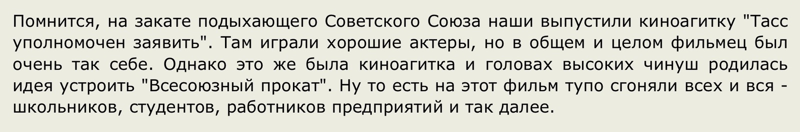 Всё бы ничего, но "ТАСС уполномочен заявить"- это десятисерийный телефильм. Рейтинг у которого, кстати, 7,9