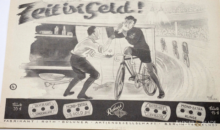 Мы постарались подобрать несколько фотографий той эпохи. Хотите увидеть часть рекламы Rotbart? Конечно, это реклама весьма проста и наивна, но по-видимому она, работала, раз тогда эти бритвы были так популярны.