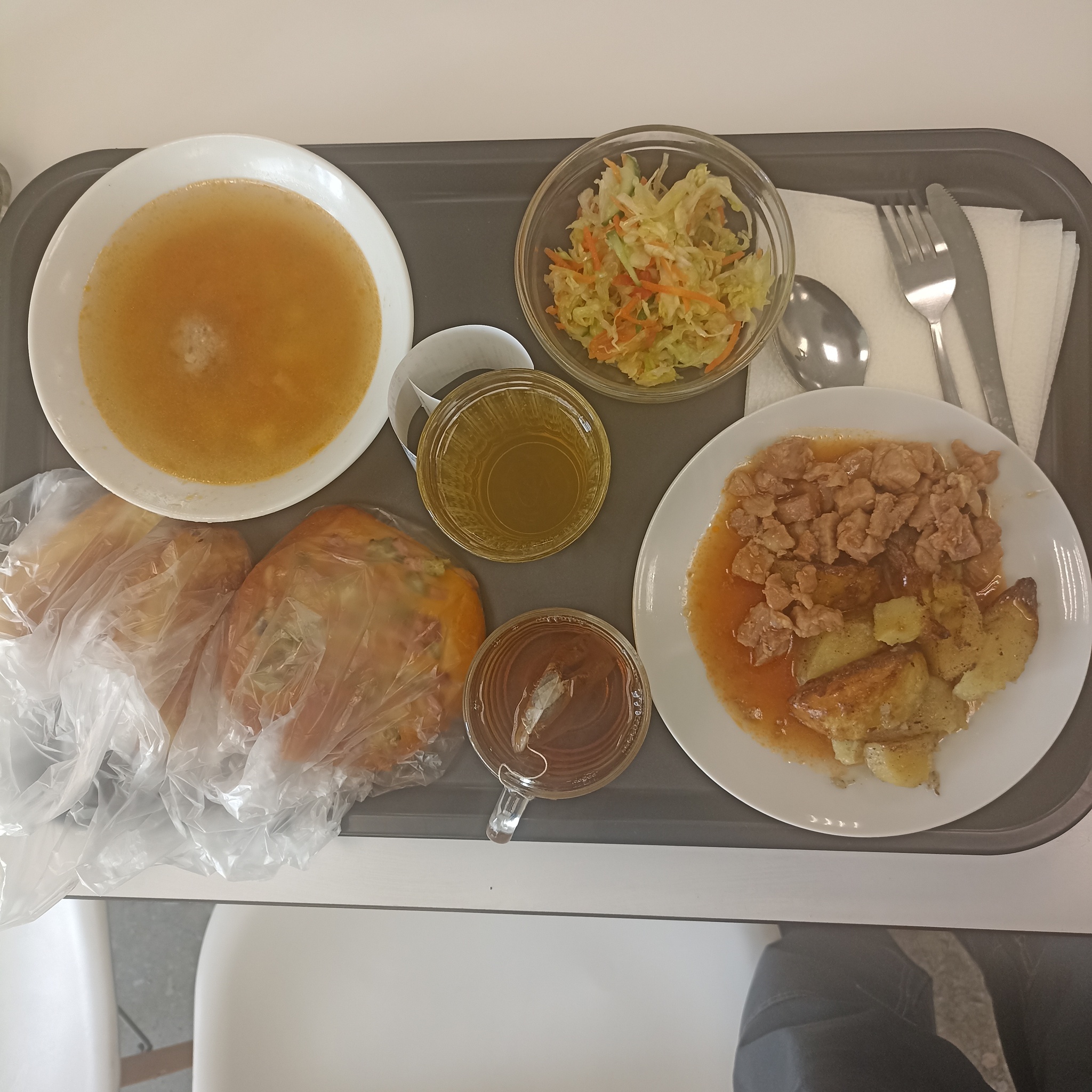 2 jpegcoma 5 месяцев назад Обед на заводе ч7 Сегодня было даже ничего В меню:- суп с фрикаделькой- жаренная картоха- рагу из мяса, не понятного животного- салат витаминный- пицца школьная- пирожок с яблоком 2шт- чай- сокИтого 458р [моё] Еда Столовая Производство Ресторан Ещё 0