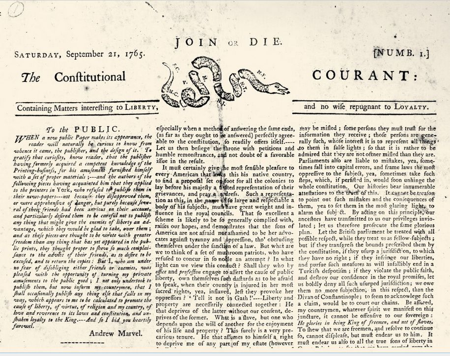 С 1774 года многие американские издания начали использовать карикатуру в своих заголовках популярных газет штатов: Massachusetts Spy, The New-York Journal и The Pennsylvania Journal. Карикатура стала одним из символов американской войны за независимость а так же примером отличной оригинальной политической агитации.