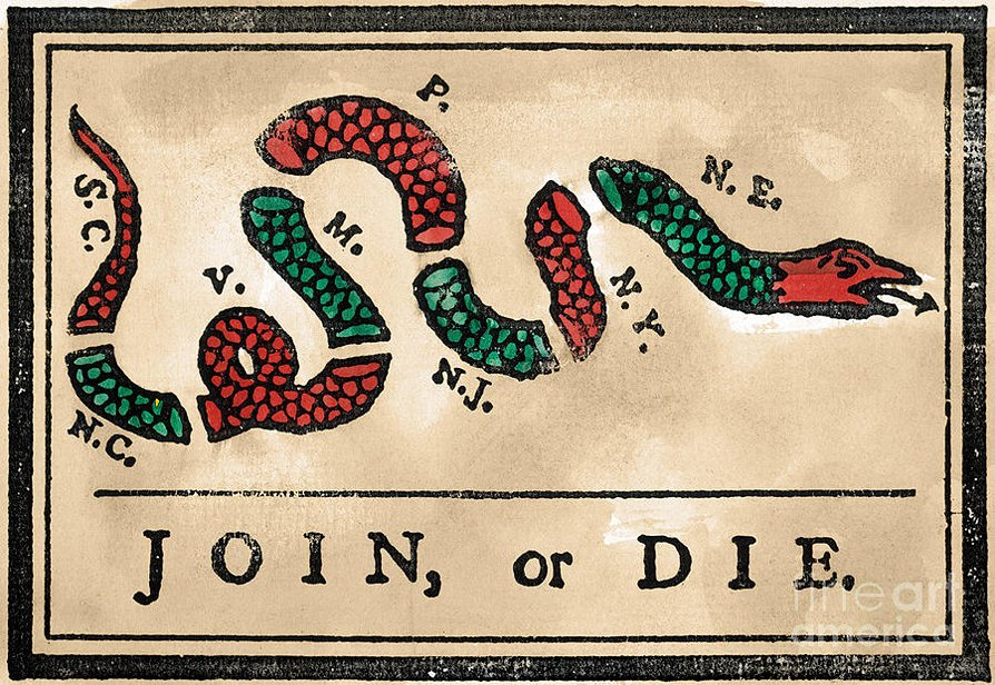 Карикатура основана на суеверии, что если разрезать змею на куски и сложить их до захода солнца, то змея воскреснет. Голова змеи Новая Англия (N.E.), далее Нью-Йорк (N.Y.), Нью-Джерси (N.J.), Пенсильванию (P.), Мэриленд (М.), Виргинию (V.), Северную и Южную Каролину (соответственно N.C. и S.C.).
