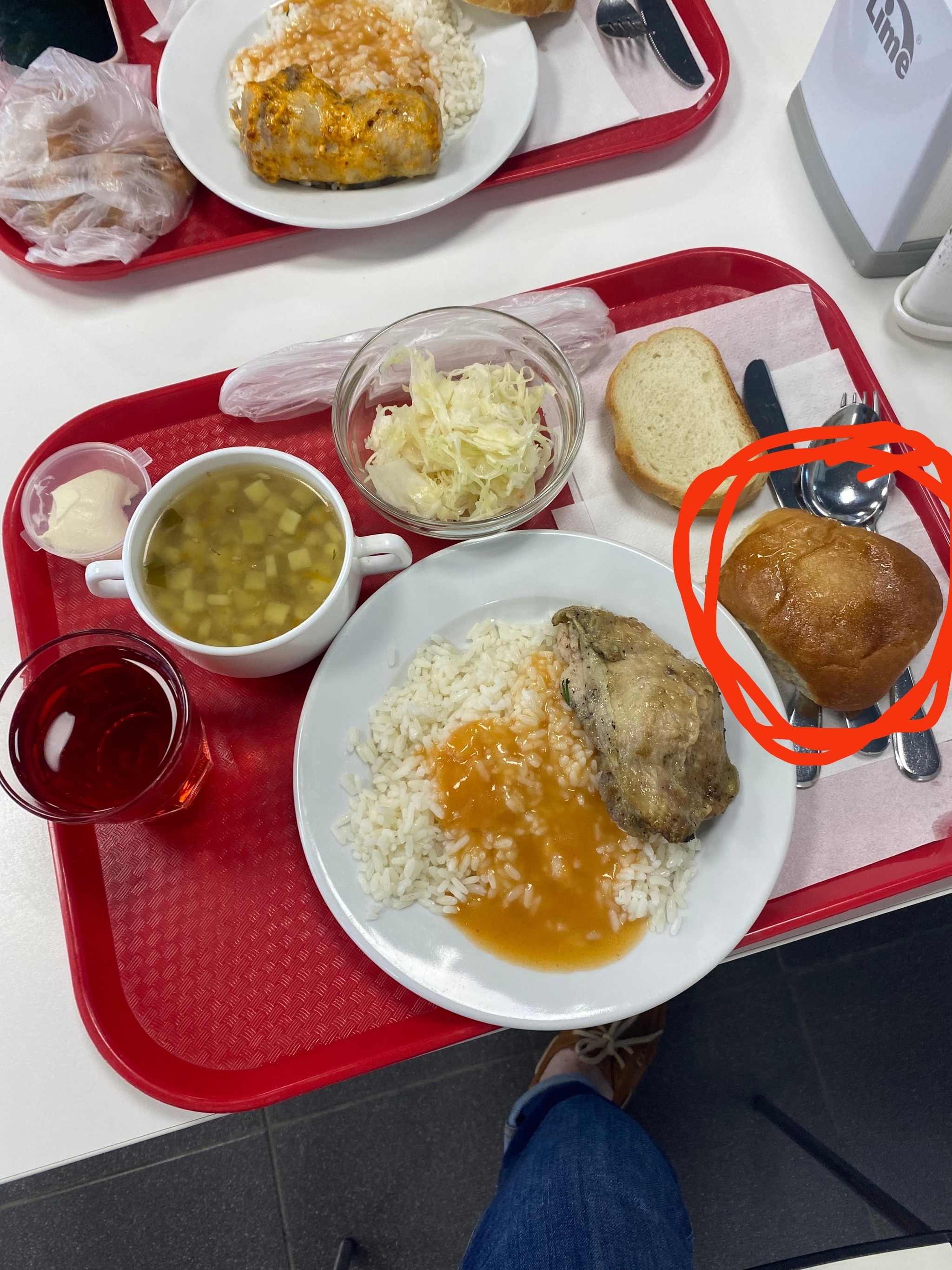 На фото: рассольник, гречка с филе курицы, салат с курицей, хлеб, напиток каркаде. В комплекте еще идет булочка к каждому обеду, но я ее не беру.