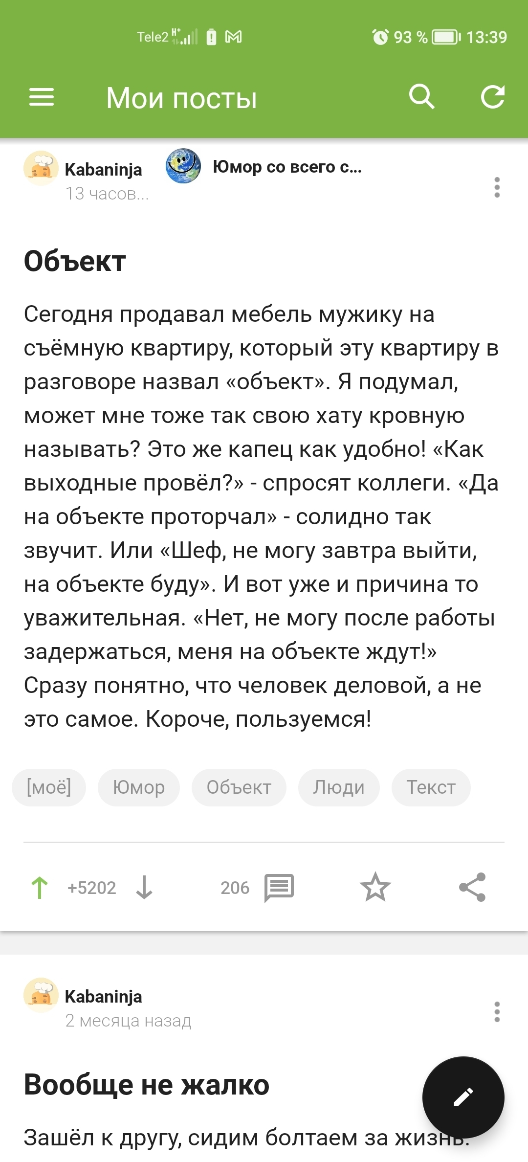Сегодня продавал мебель мужику на съёмную квартиру, который эту квартиру в разговоре назвал «объект». Я подумал, может мне тоже так свою хату кровную называть? Это же капец как удобно! «Как выходные провёл?» - спросят коллеги. «Да на объекте проторчал» - солидно так звучит. Или «Шеф, не могу завтра выйти, на объекте буду». И вот уже и причина то уважительная. «Нет, не могу после работы задержаться, меня на объекте ждут!» Сразу понятно, что человек деловой, а не это самое. Короче, пользуемся!