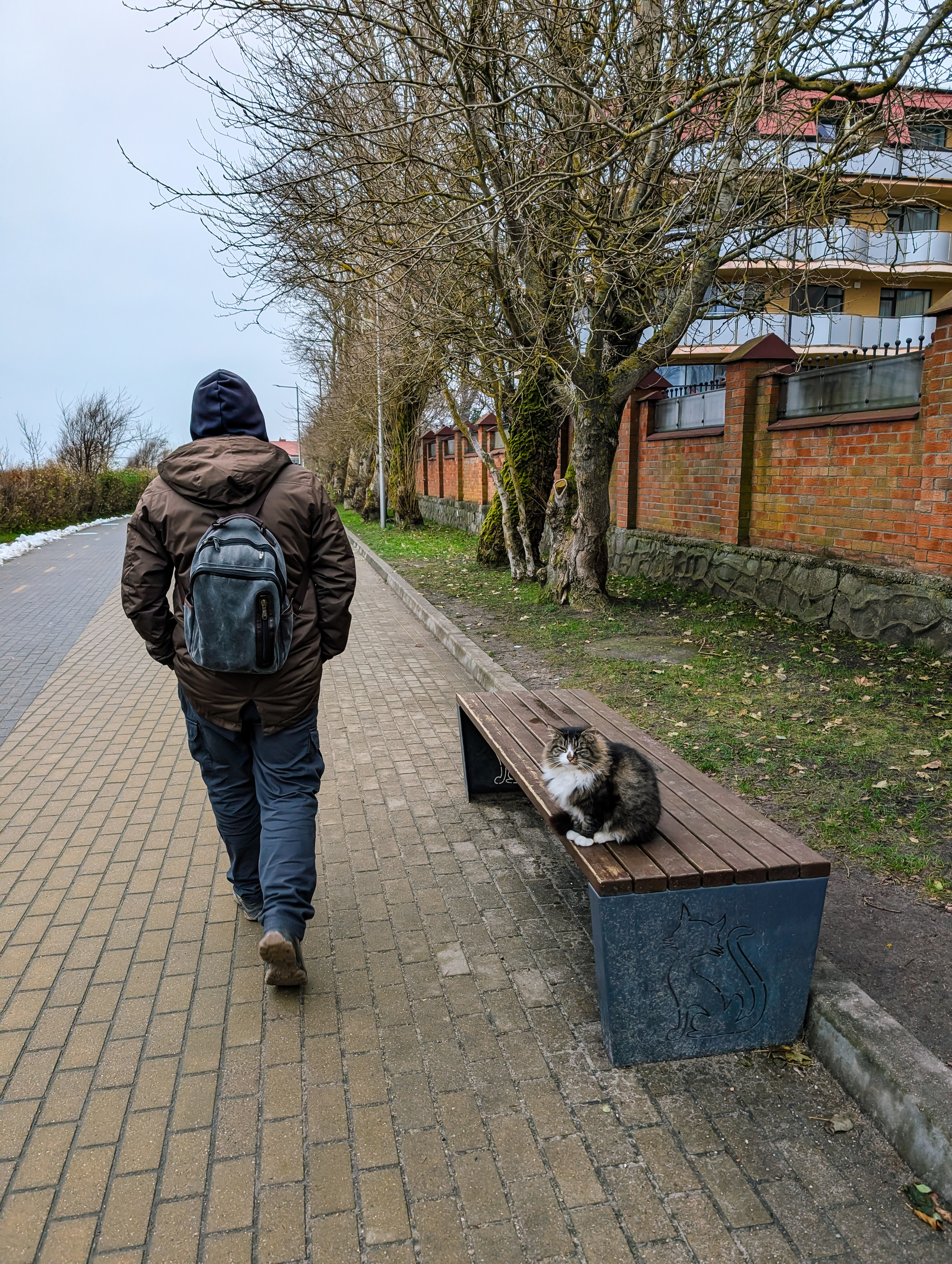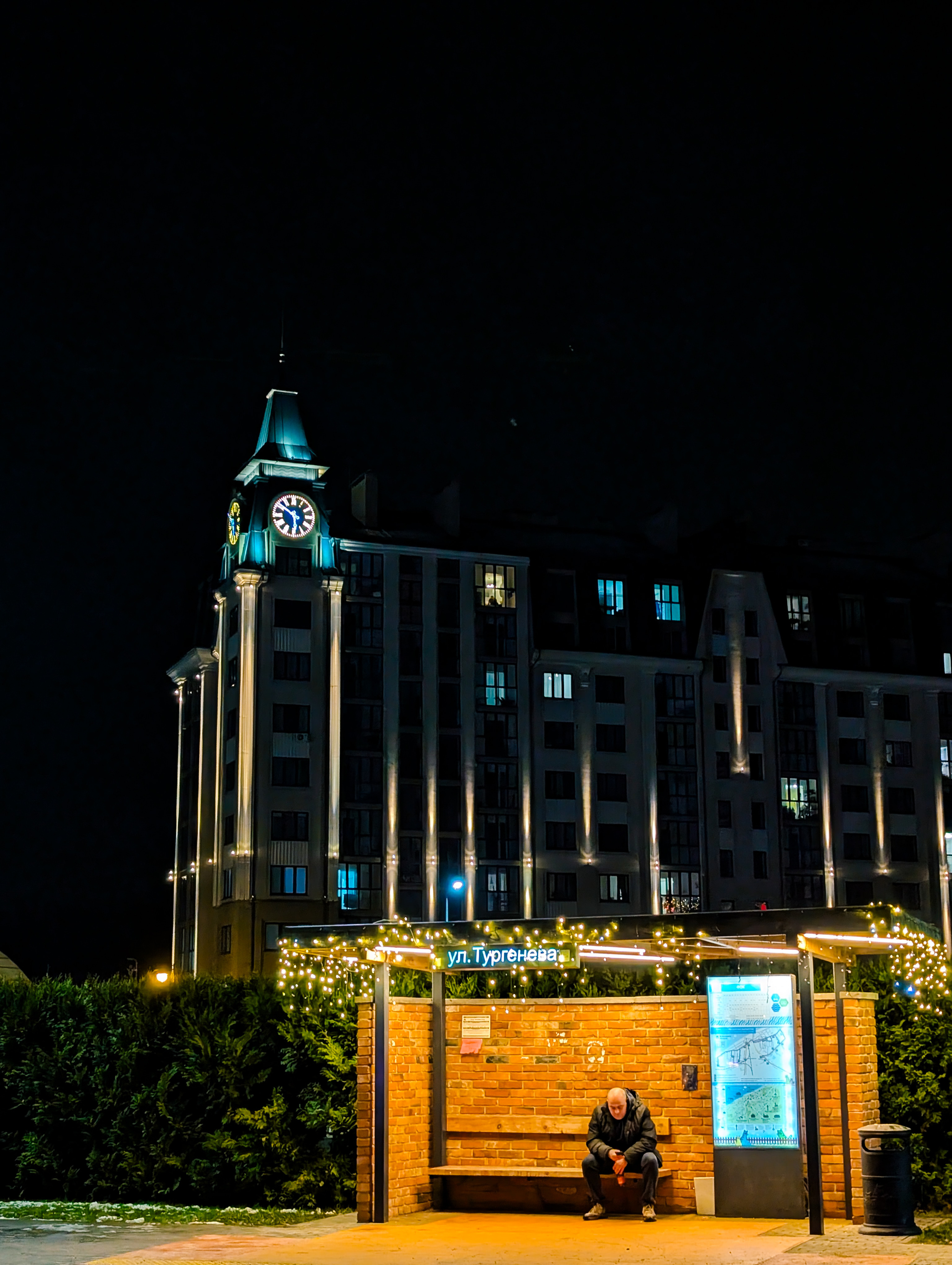 Вот тоже грустный человек сидит. Наверное, потому что уезжает из Зеленоградска. За ним как раз жк, где еще можно было в начале декабря по приемлемым ценам снять квартиру на выхи. Правда до моря придется пройтись.
