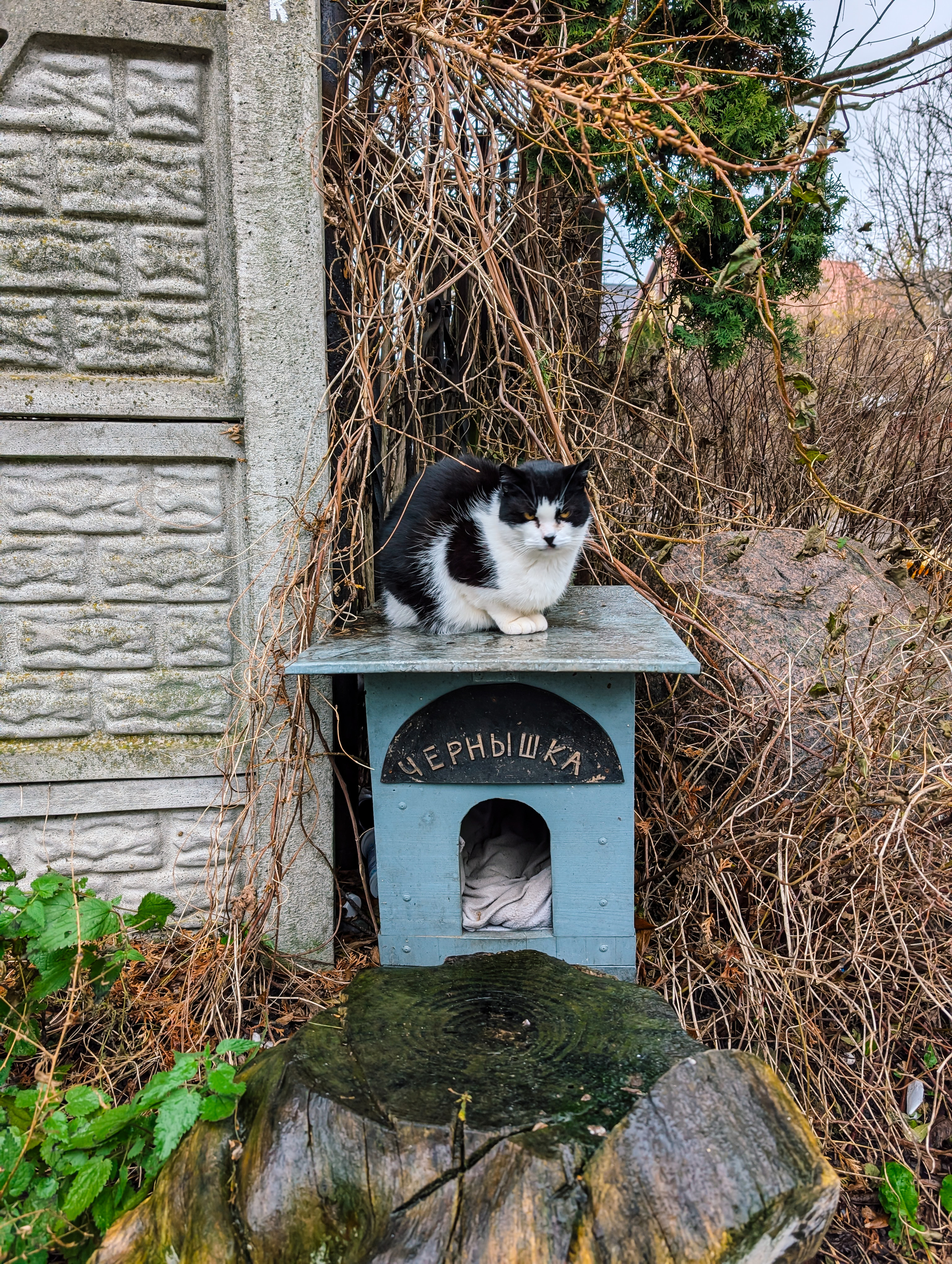 Вот первый экземпляр по пути. Чернышка. У Чернышки своя будка и целая батарея из мисочек.