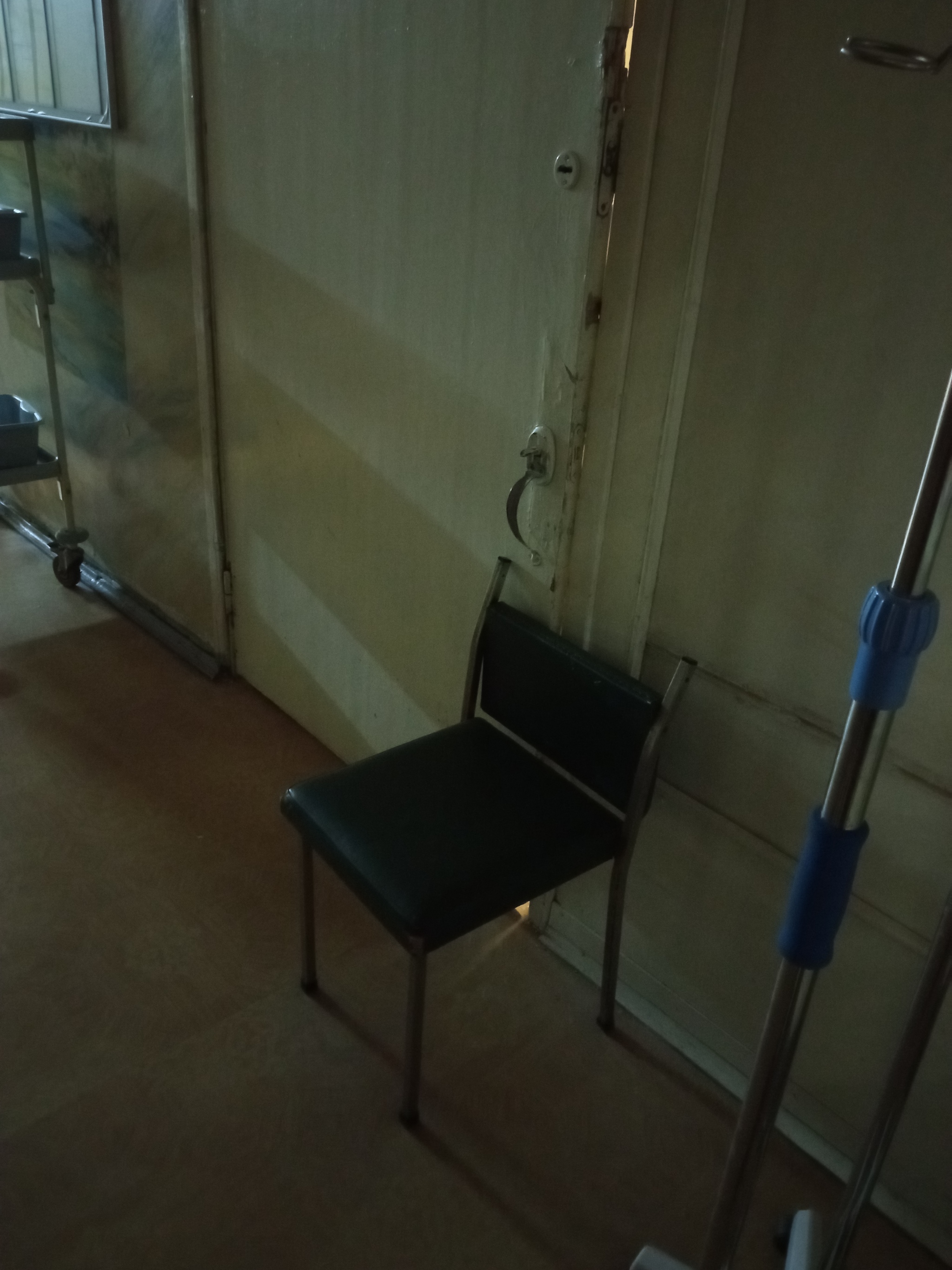 Коридор со стойками под капельницы, стулом, кстати, был подпёрт процедурный кабинет.