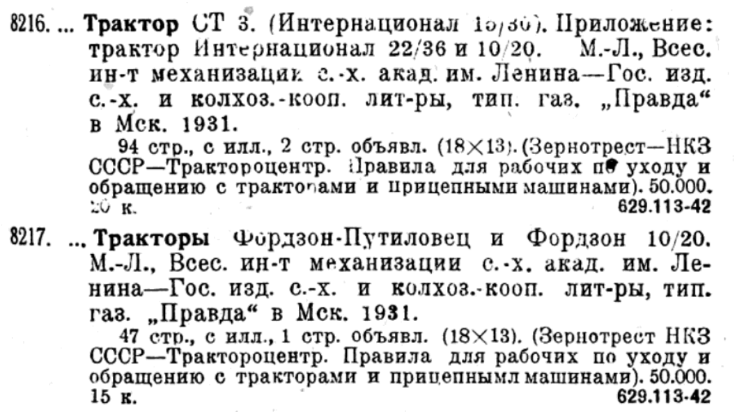 Выписка из "Книжная летопись" за 1931 год по которой видно, что современные переживания "Ах, это не собственная разработка, а копия" в те годы вообще были бы не поняты. Стране нужны трактора, а валюты для покупки готовых тракторов не напасёшься. Поэтому за бешеные деньги купили в США готовы завод и поставили в Сталинград.