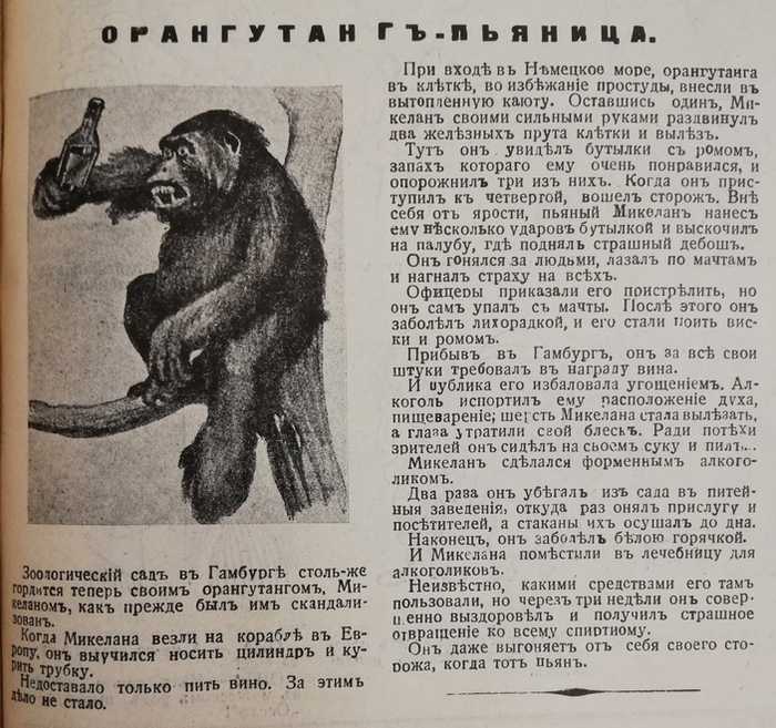 «Зоологический сад в Гамбурге столь же гордится теперь своим орангутангом Микеланом, как прежде был им скандализован. Когда Микелана везли на корабле в Европу, он выучился носить цилиндр и курить трубку. Недоставало только пить вино. За этим дело не стало.