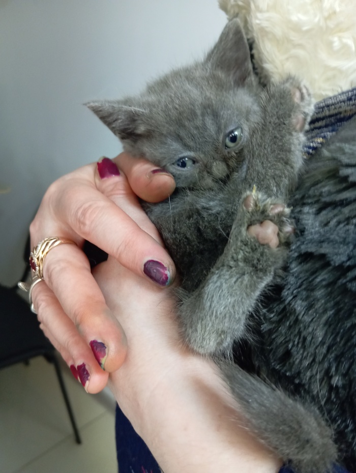 Самый маленький котёнок, брат Алекса... Назвали Зевс, но на приёме выясняется, что это не Зевс, а Ева... Впрочем когда я привезла в клинику Алекса, нас тоже ждал сюрприз, впервой клинике не только не смогли отличить гной и мочу, но и пол котёнка, в итоге Алекс тоже оказался девочкой.
