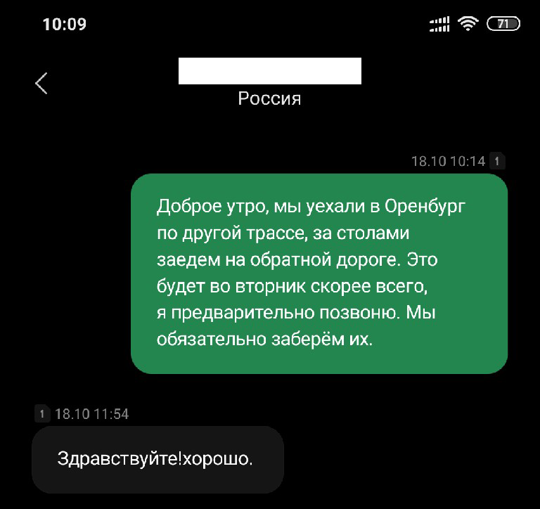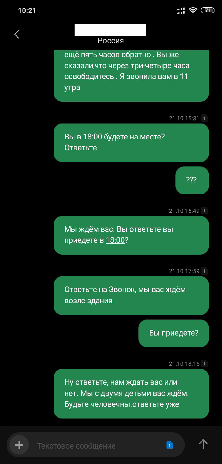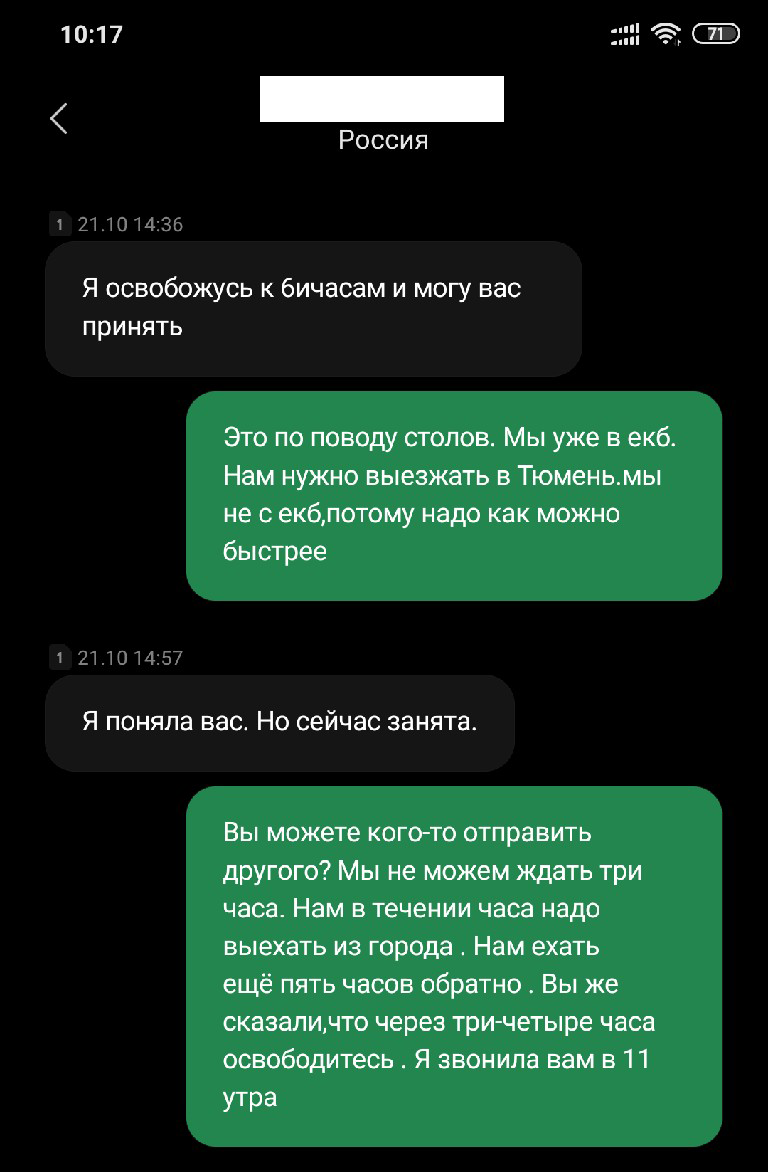 Ни на одно сообщение ответа не последовало, все звонки сбрасывались, и нам ни с чем пришлось уезжать в Тюмень, и ехать по темноте с двумя детьми 325км.
