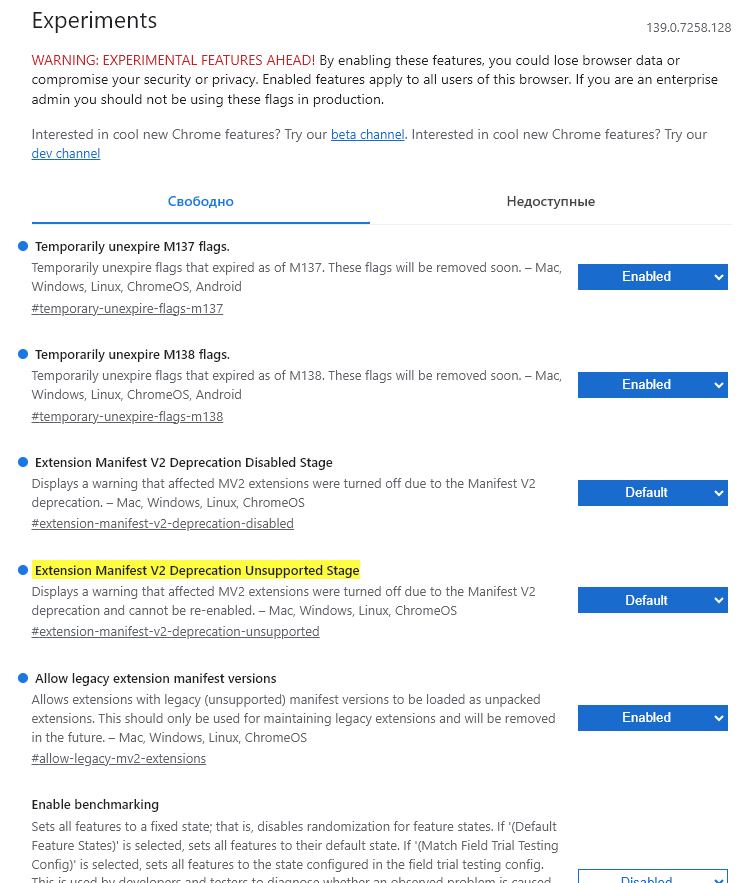 chrome://flags/#extension-manifest-v2-deprecation-unsupported — Disabled