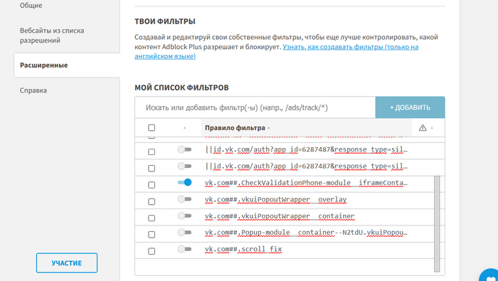 Вот все элементы на странице vk, которые видит Адблок. За блокирующее окно отвечает блок vk.com##.CheckValidationPhone-module__iframeContainer......