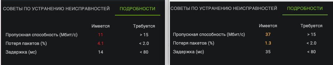 В результате тестов была получена слудующая картина. На Российском сервере (GFNRU) был лучше пинг, но намного меньше скорость. На Европе всегда высокая скорость (до 50Мбит было даже), но выше пинг. На скрине слева - РФ, справа - Европа.
