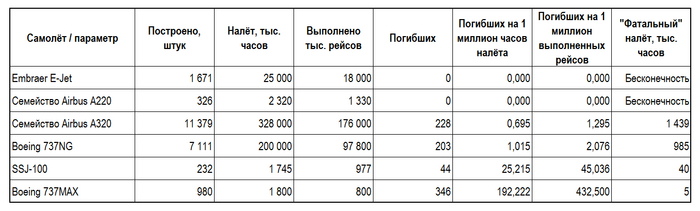 Резюме: SSJ-100 в эксплуатируемой версии в 36 раз хуже (по риску гибели в авиакатастрофе), чем Airbus А320, в 25 раз хуже, чем Boeing 737NG, но в 8 раз лучше Boeing 737MAX.