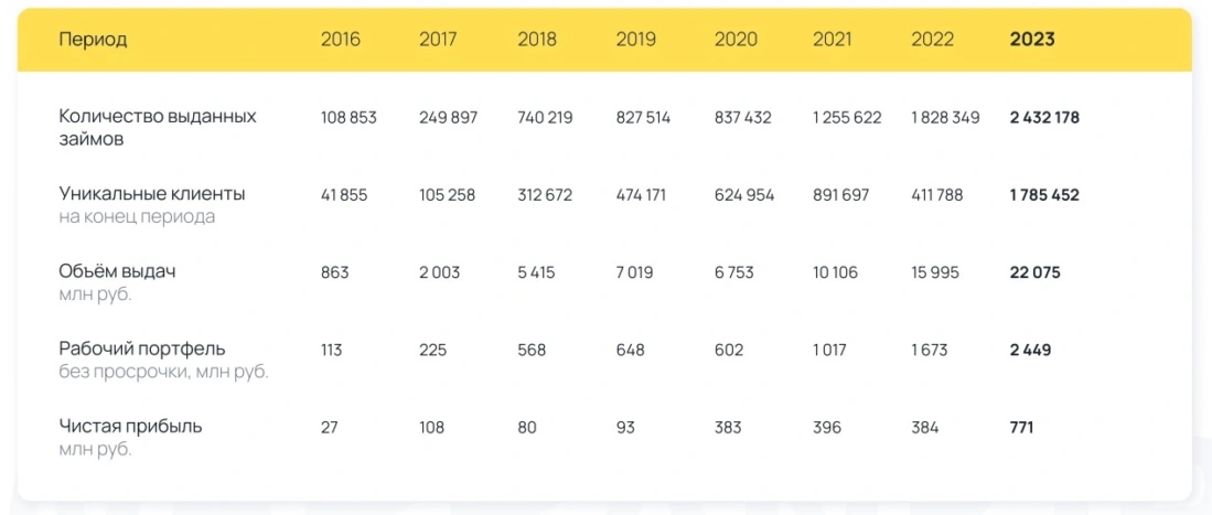 Компания осуществляет свою деятельность с 2014 года и за этот период успела выдать более 8,3 миллионов займов на общую сумму 70,5 млрд. рублей. Если мы возьмем в руки калькуляторы, то средний размер кредита составляет 8 500 рублей.