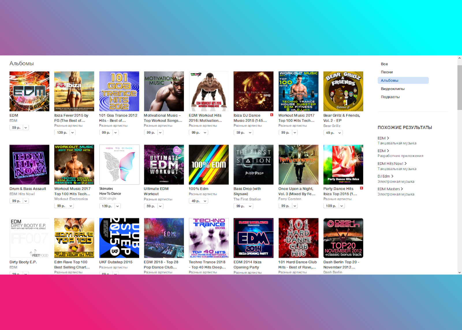 Конкретно из электроники: брэйкс, драм, транс, техно, инструментал. В принципе, качественный атмосферный хаус можно. Но вот едм...пара однотипных семплов и не в тему втыкаемый инструментал - убогая попытка переклепать транс. Не хотелось, но раз вам это нужно)