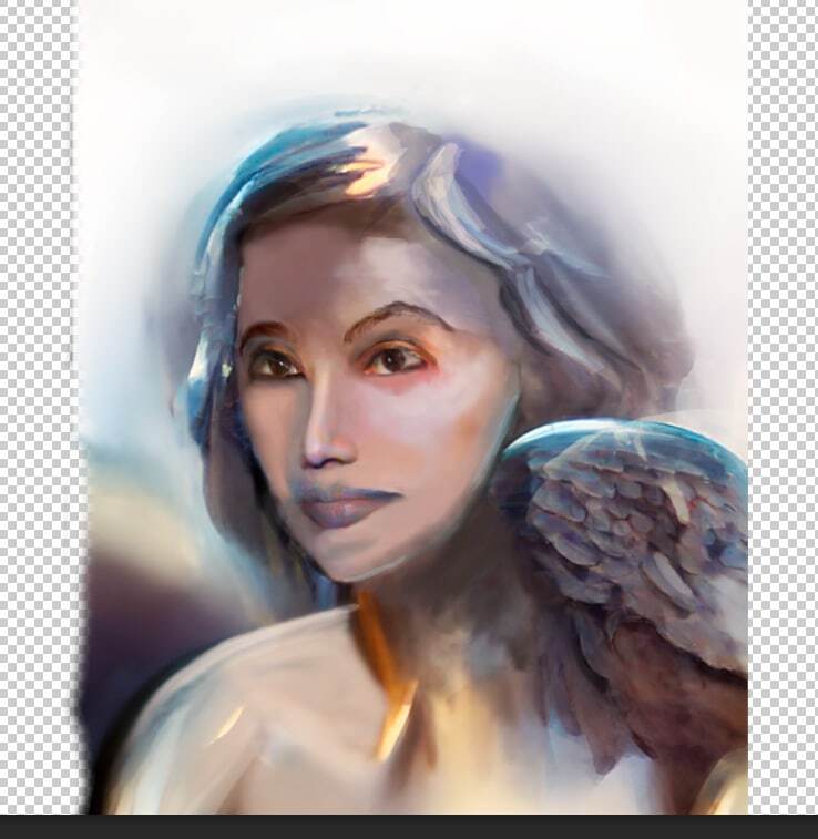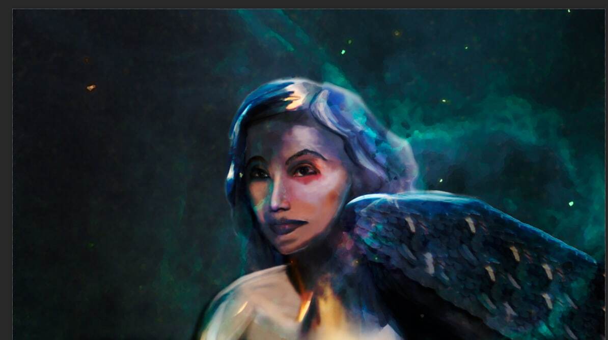 Глаза и рот темнокожей, нос бледнолицей. Крыло мне дорисовал сам фотошоп с помощью инструмента "заливка с учетом содержимого" нашла на стоках бесплатное фото космоса и использовав фильтр из галлереи сделала его фоном. Осталось только подписать и использовать для обложки на ютуб) На обложку пошло уже вот так