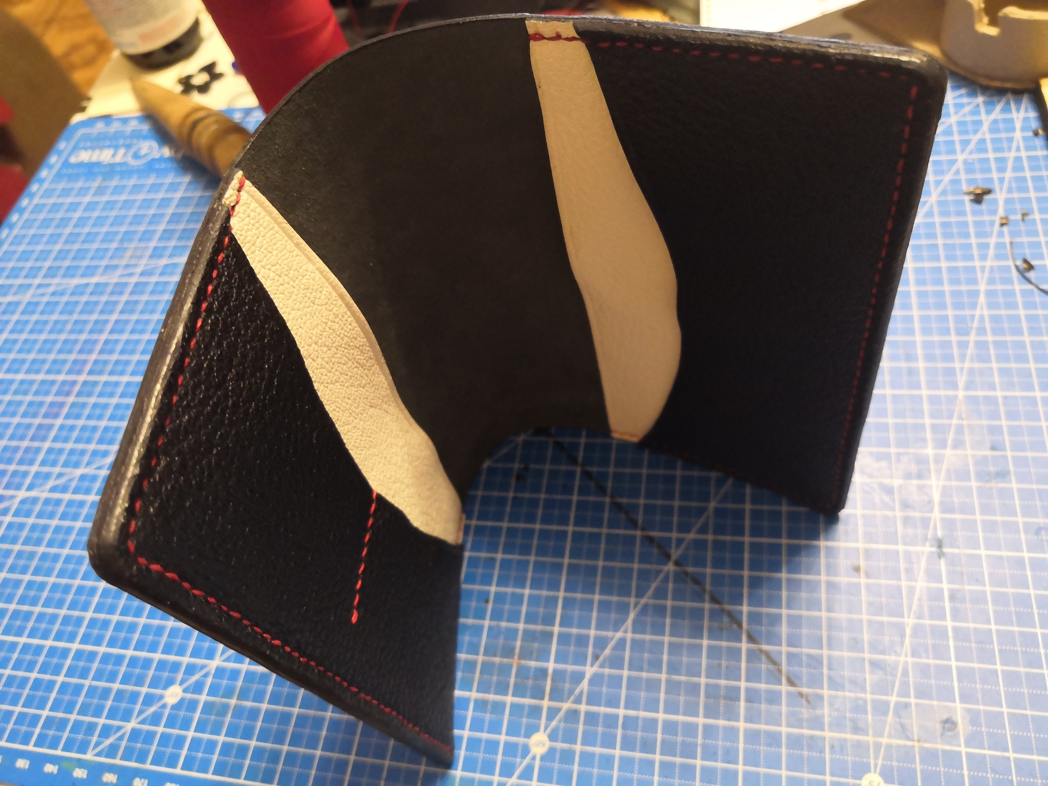 Склеил, пробил, прошил. Цвет ниток - пожелание клиента, я предлагал белые, в цвет основных кармашков.