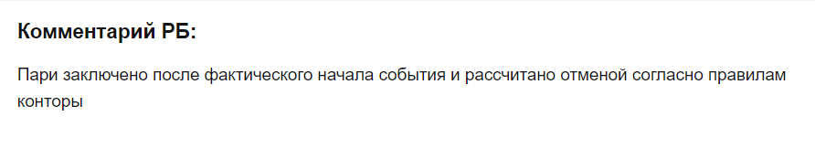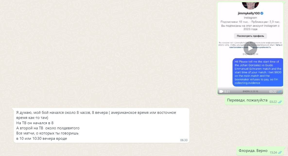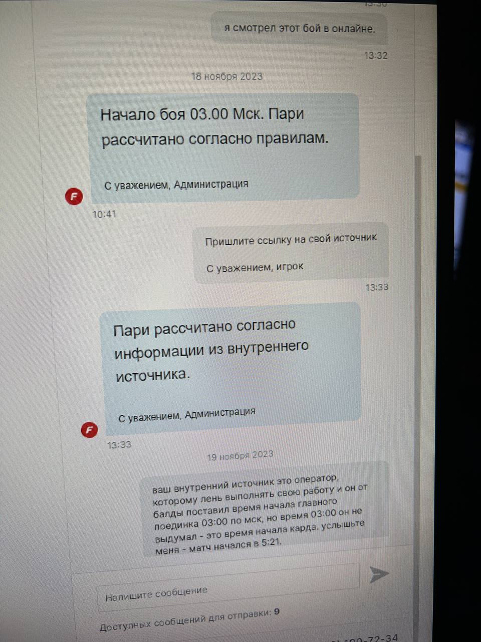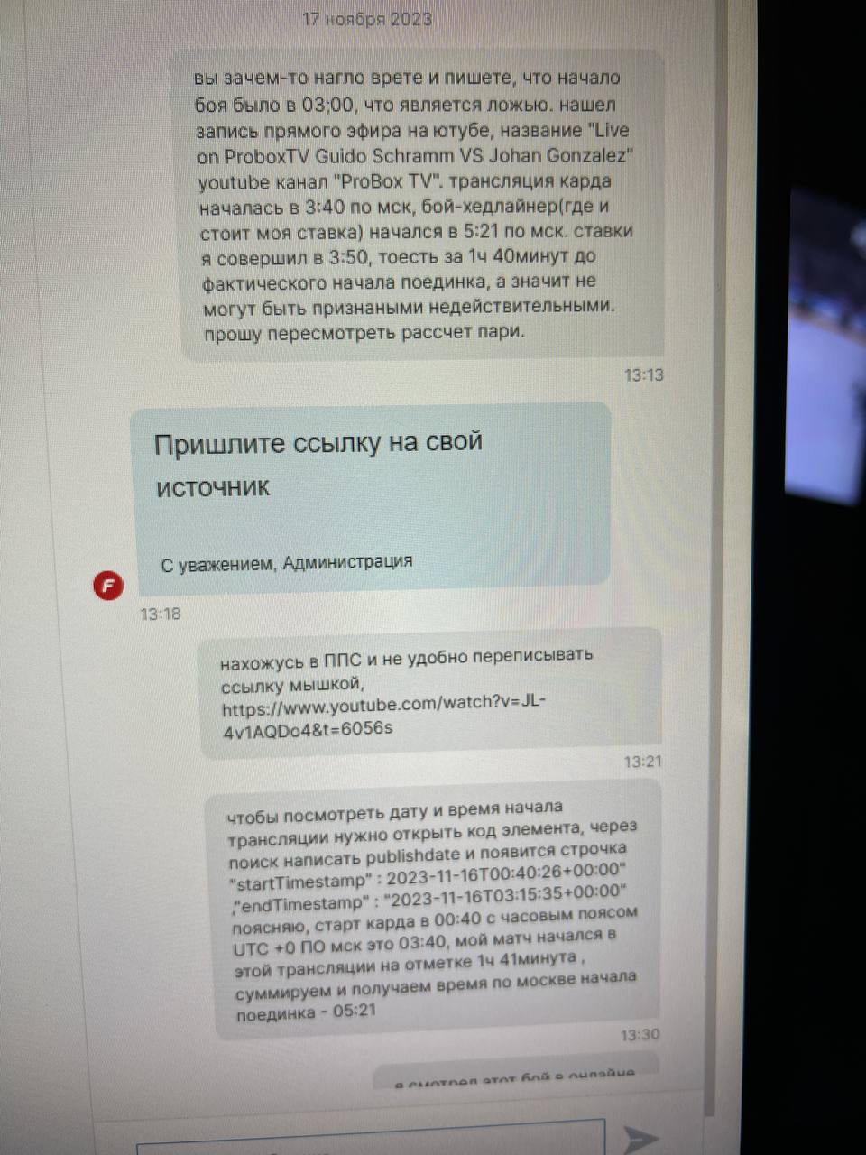 16.11.2023 в 03:50 по мск я совершаю серию одинаковых прематч-пари (по рекомендации сотрудника из-за акции дроблю одну ставку на несколько) на победу Хоан Гонсалеса против Гвидо Эммануэль Шрамма в их боксёрском поединке. Спустя время прихожу домой, включаю прямую и единственную трансляцию на официальном YouTube канале промоушена "ProBox TV", в 5:21 по мск начинается мой поединок, смотрю, радуюсь итоговой победе моего боксёра. На утро прихожу в ППС за деньгами и вижу, что мои ставки, которые должны были быть рассчитанными выигрышем помечены возвратом (расчёт пари с коэф. 1). Далее пишу в поддержку через тикет-систему внутри ставкомата, ответ их меня удивил: "вы совершили пари на уже начавшееся событие, матч начался в 03:00 по мск"