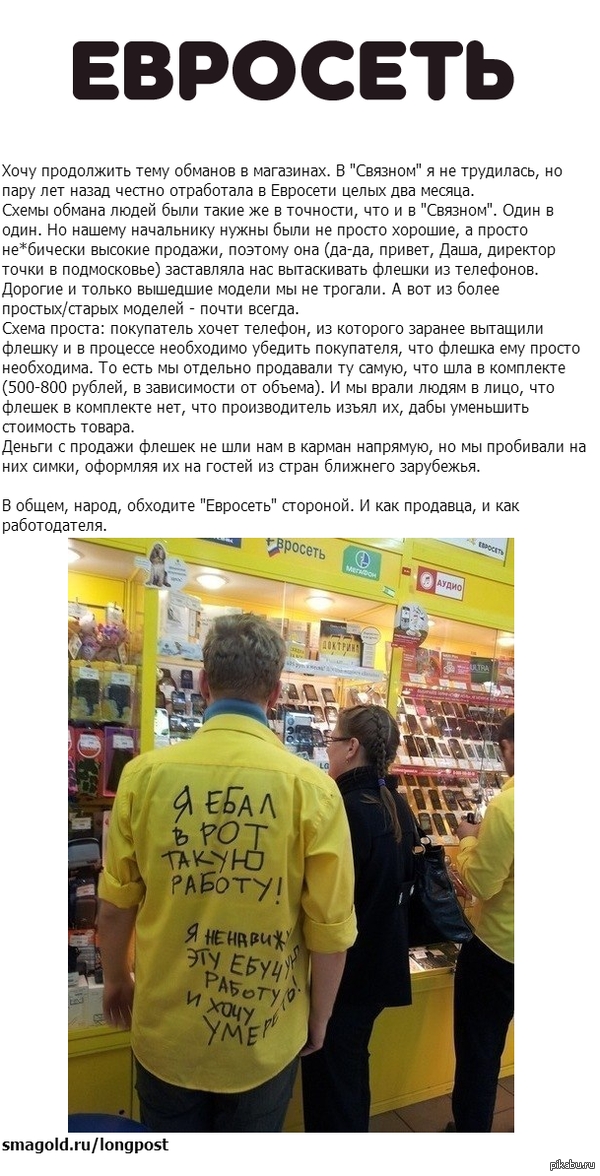 1027 lileward Обман в "Евросети" 11 лет назад дело было пару лет назад, но схемы не меняются. Евросеть Связной Продавец Обман Пост