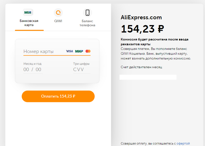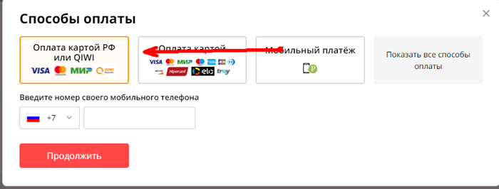 В способах оплаты выбираем "картой рф или киви" Вводим номер киви кошелька