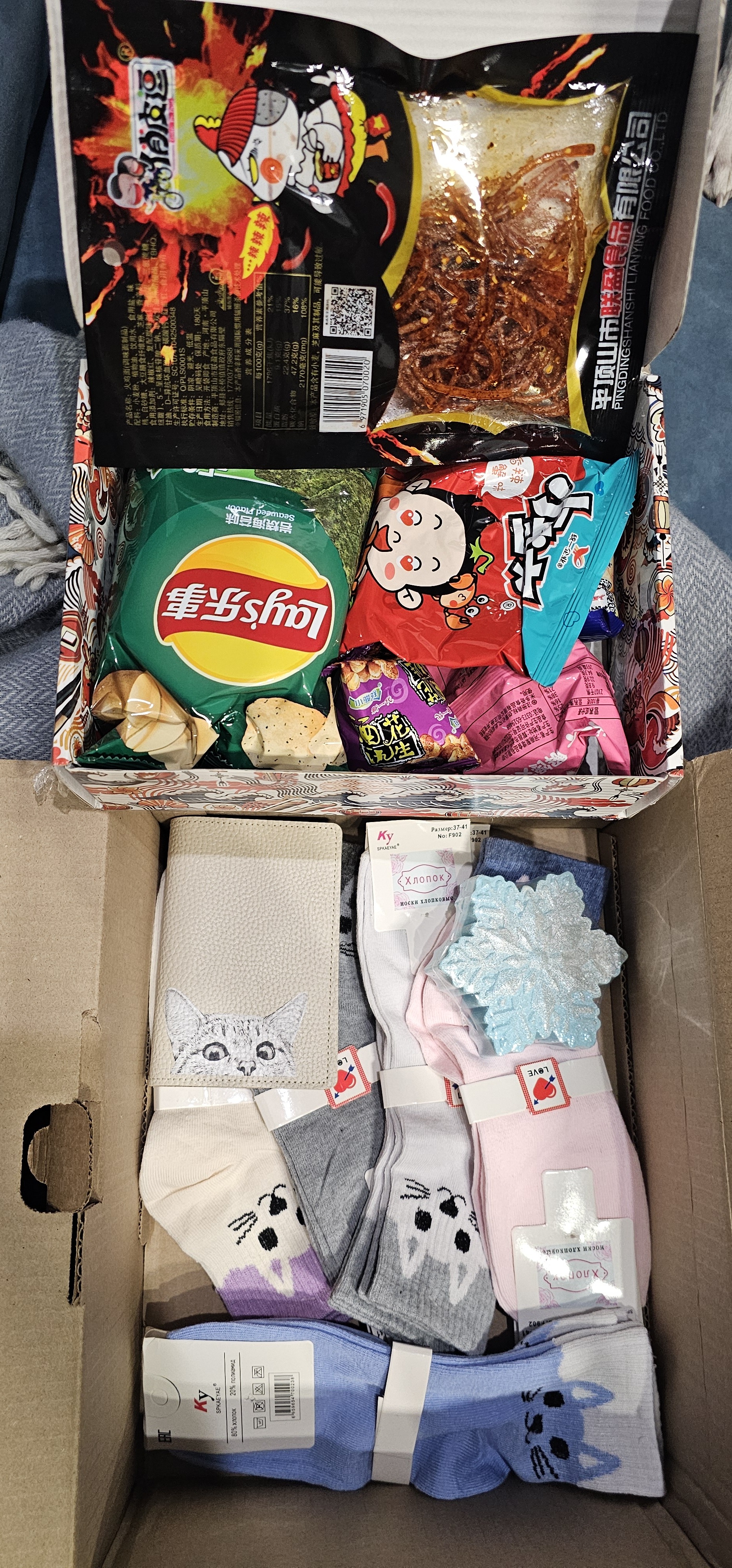 Набор вкусняшек (писала, что люблю соленое, на не сладкое), носки (обожаю носки, о чем тоже писала), очень вкусно пахнущая бомбочка для ванны (тоже из моих интересов), обложка на паспорт (и тоже из пожеланий, так как все документы у меня рвутся)