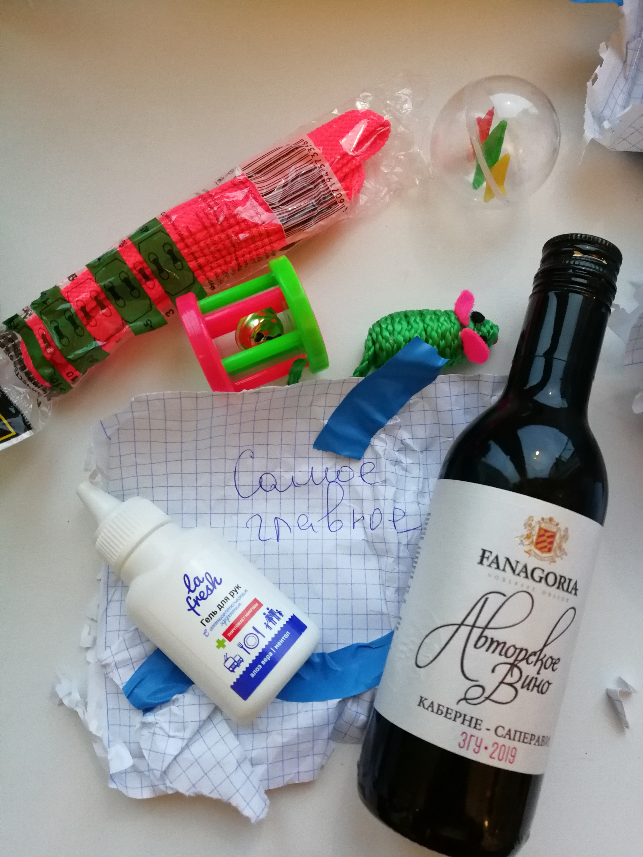 А там - самое главное! Антисептик, бухлишко, кошачьи игрушки и яркие шнурки!)) Чтоб если довелось повеситься, не растерялась атмосфера праздника!))