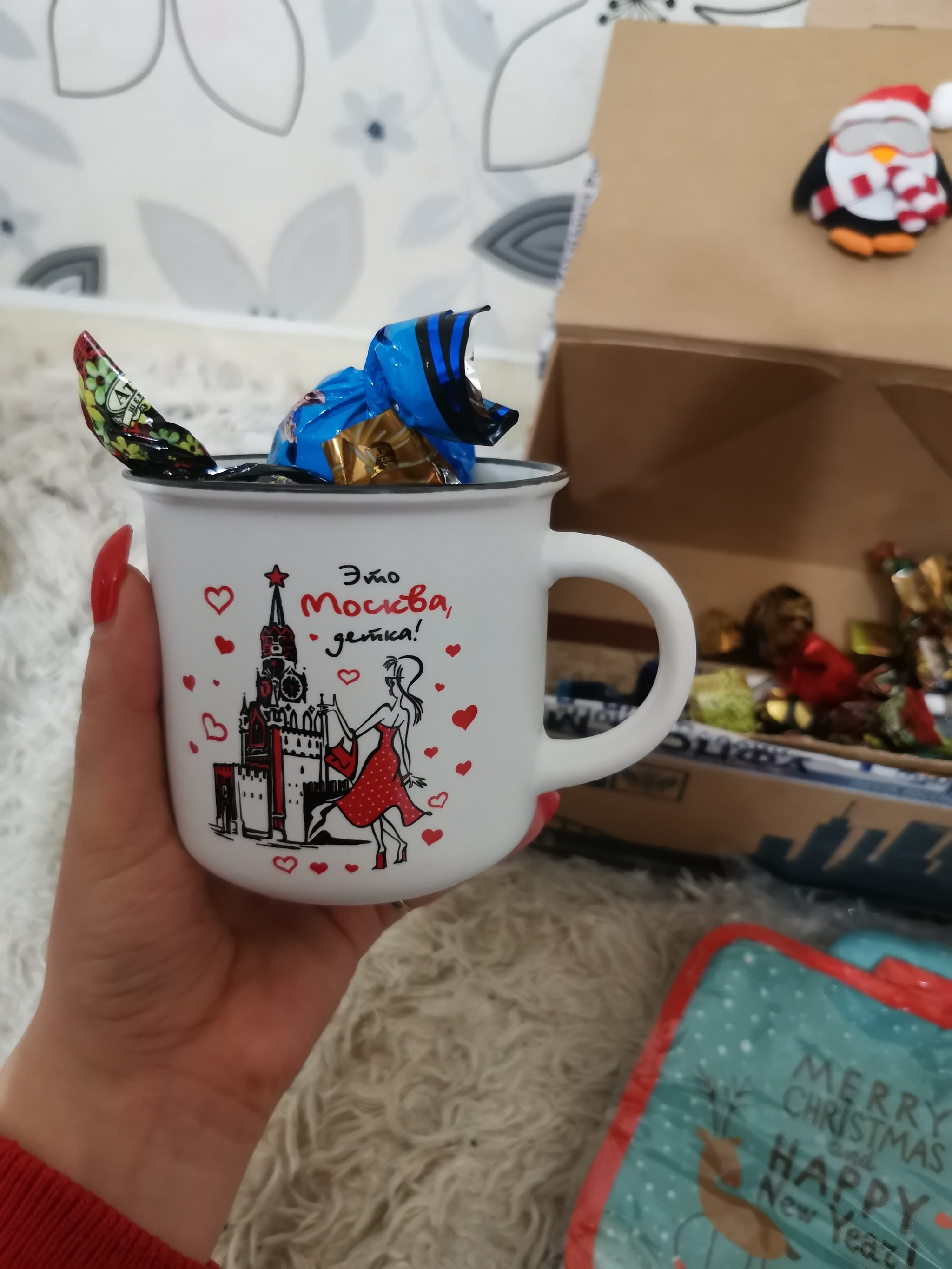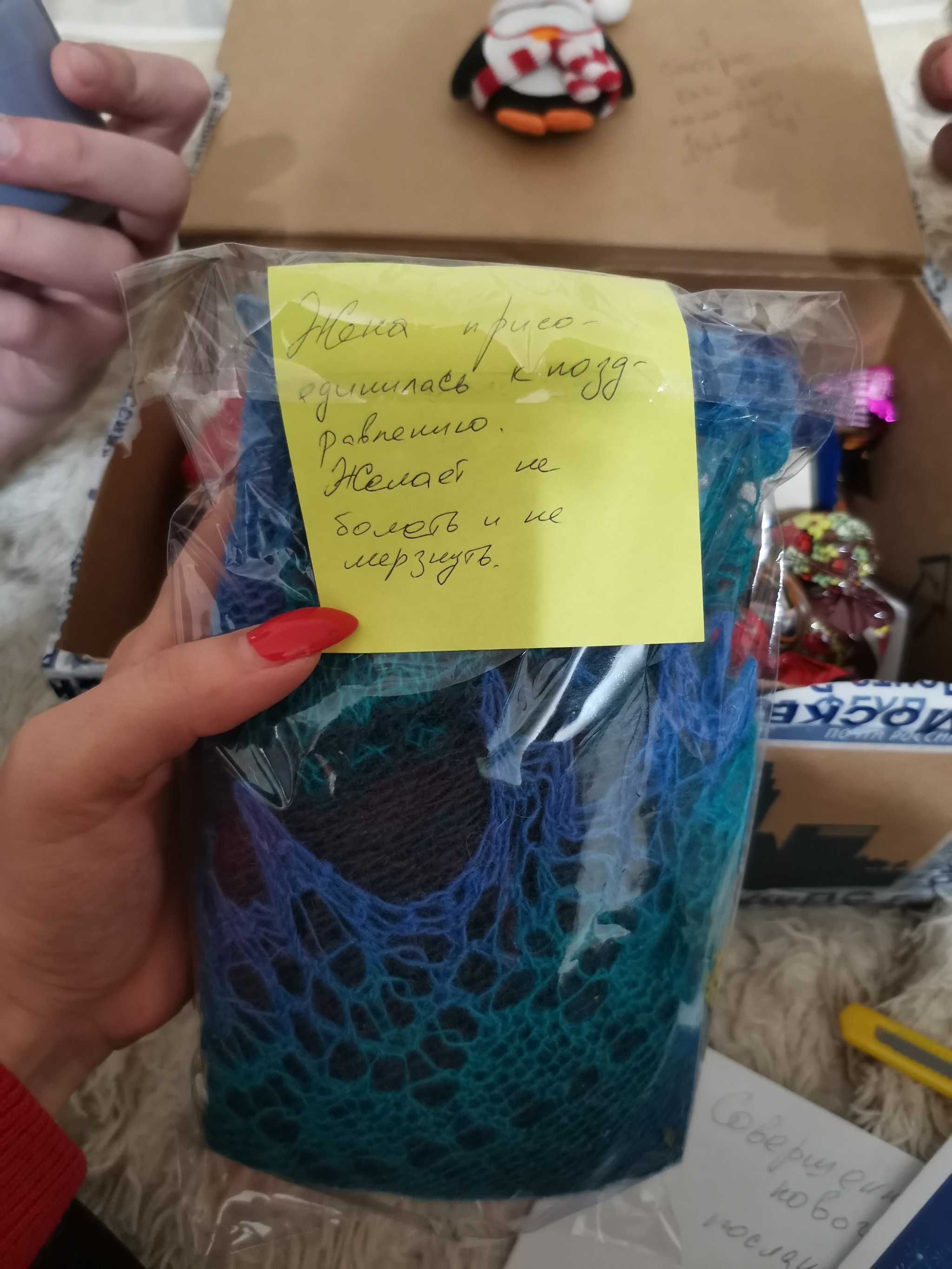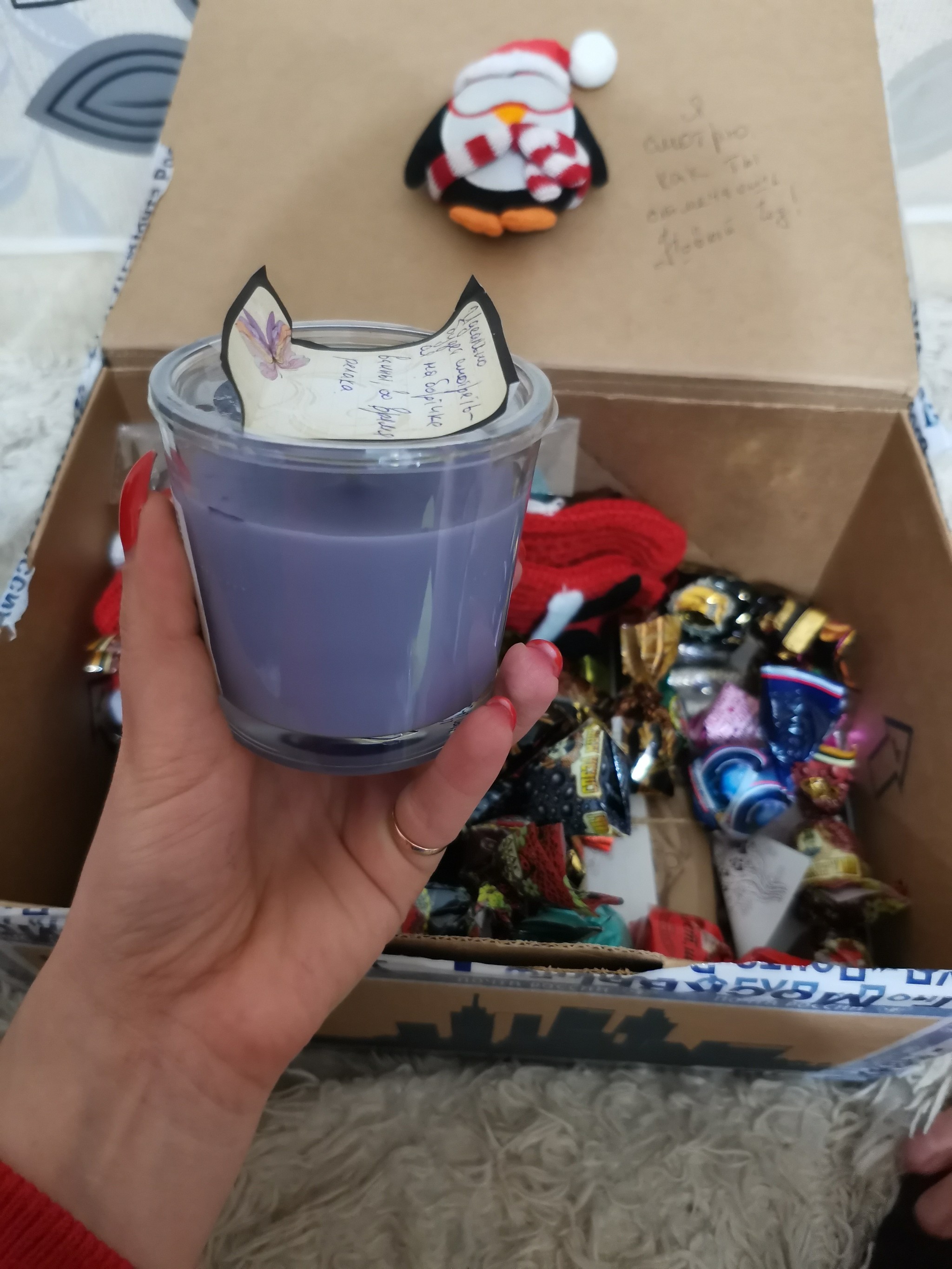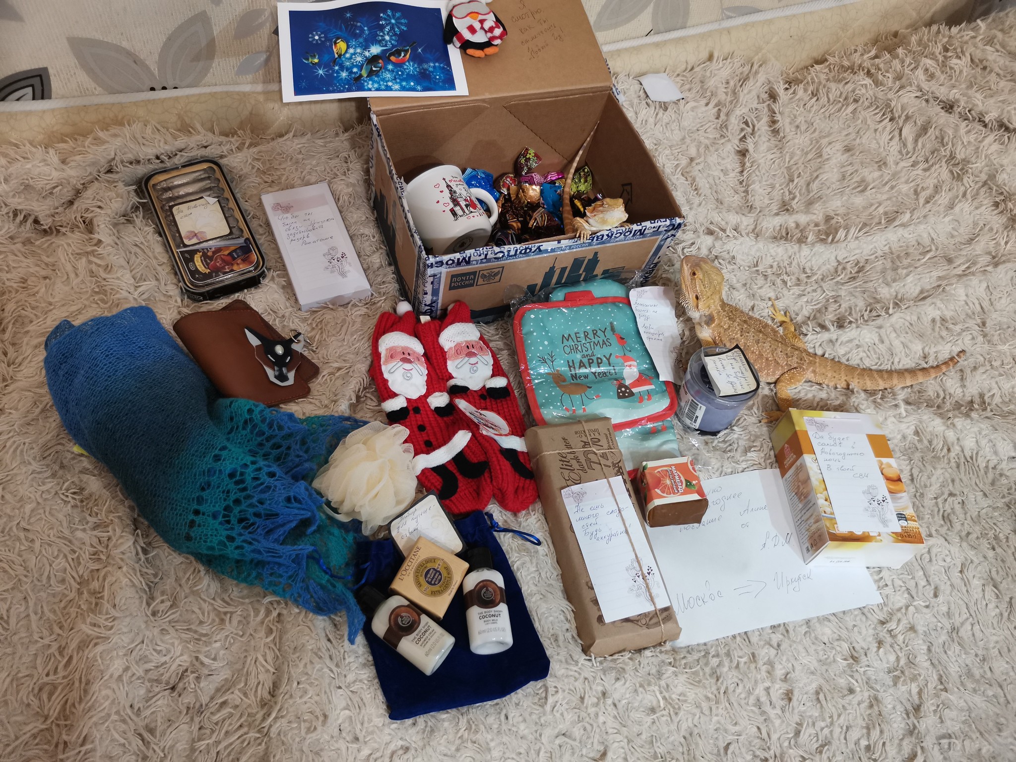 Всей семьёй очень ждали, когда получили очень обрадовались. Даже нет, не так..Эндарфины зашкалили у всех членов семьи. В коробочке оказалось очень много полезных и вкусных вещичек. А ещё оригинальная открыточка с поздравлением, ммм так приятно 👏Супер кружечка, вкусняшки, красивый шарфик, носочки, волк брелок и обложечка из кожи на паспорт. Муж оценил очень Повер для того, чтоб быть на связи всегда. Принадлежности для посещения арома ванны с вкусно пахнущей свечей и гелем для душа. А ещё оригинальные конфетки с неменее оригинальными названиями 🔥👍😊Огромное спасибо мой дедушка, и конечно же спасибо Снегурочка твоей 👏👏👏👏❤️