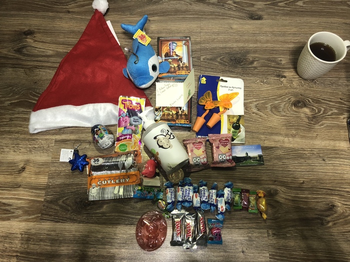 А вот и вся посылочка) Тут игрушка, колпак Санты ( собрал образ в офис)) дозатор для чего-то рыльно-мыльного, пробки для бутылок, ёлочная игрушка, отличный магнитик на холодильник и пластиковые чайные ложки)))) За пазл Звездные войны конечно спасибо ))) сладости отдал детям соседей, так как не люблю я их)))
