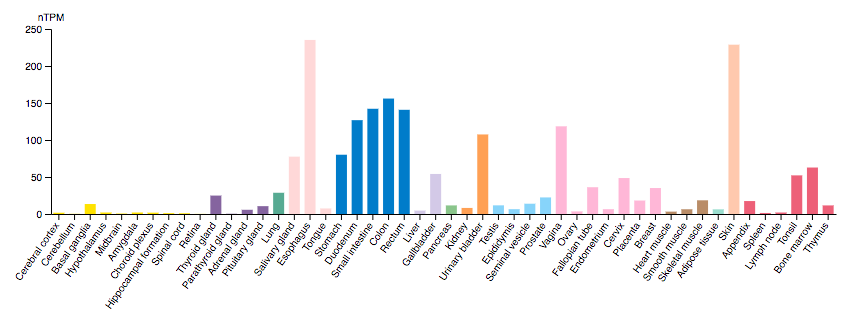 Рисунок 1. Экспрессия KLF5 в различных типах тканей ( Атлас белков человека ).