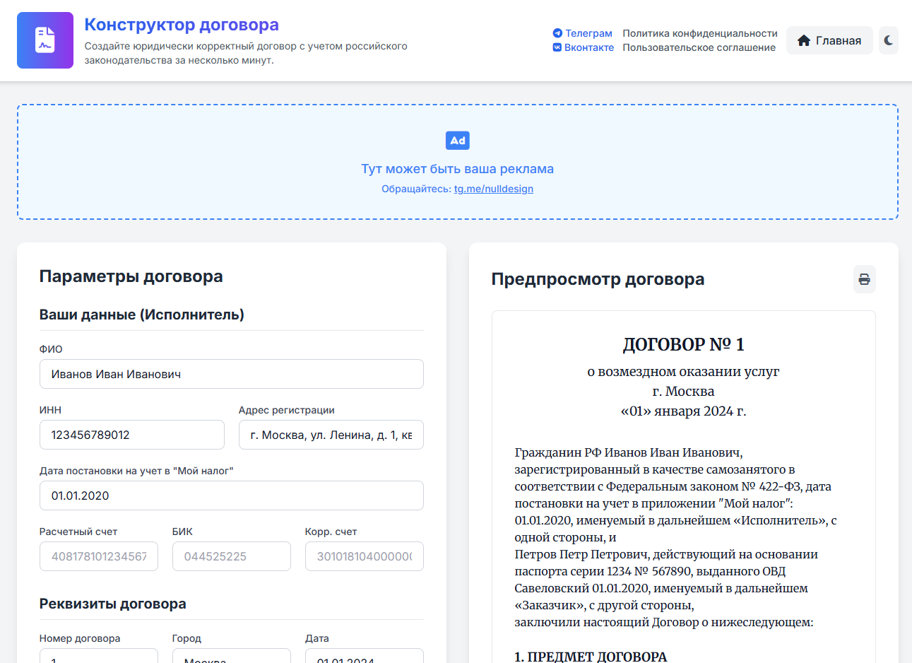 Добавлены реквизиты для оплаты и дата регистрации самозанятого.