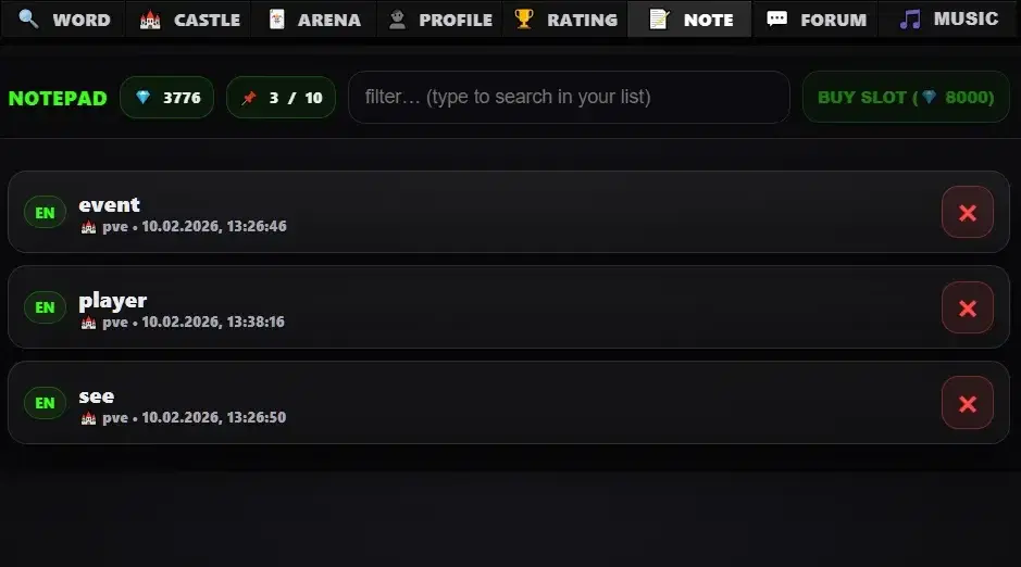 Если слово было угадано неправильно — оно автоматически попадает в Блокнот.