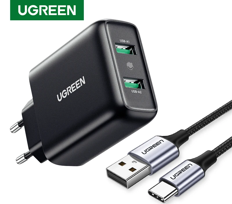 USB зарядное устройство Ugreen Quick Charge 18 Вт c 2 разъёмами USB и кабелем USB- Type-C. Стоит набор 1 080 руб. Ссылка на него