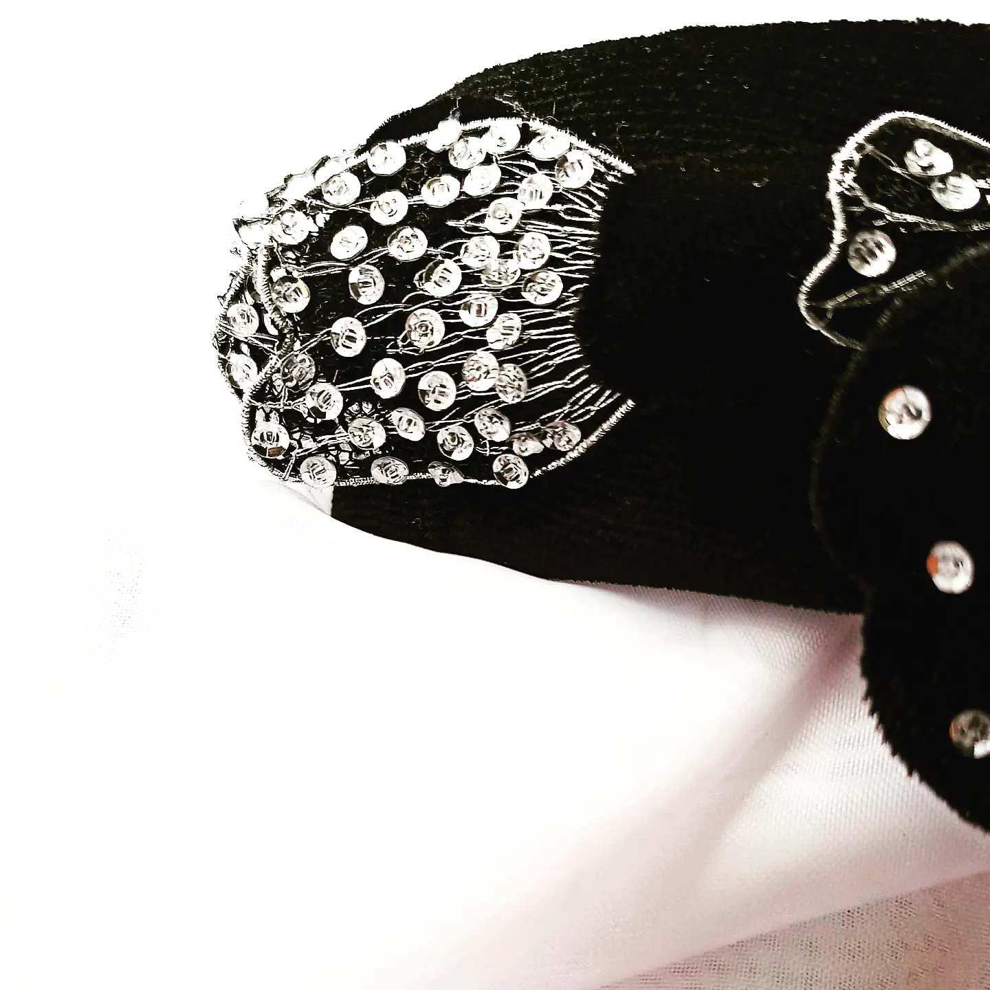 Ободок изготовлен из бархата, украшен объемными цветами расшитыми пайетками и бисером. Одна сторона декорирована сверкающими бусинами. Лёгкий основа пластик. Размер примерно 14 см в диаметре и 4 см шириной.
