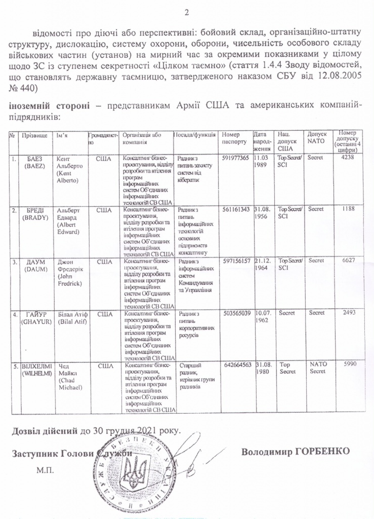 В сопроводительном письме в Генштаб ВСУ замначальника СБУ полковник Владимир Горбенко пояснил, что речь идет именно о «разрешении на передачу секретной информации представителям Армии США и компаний-подрядчиков». Допуск американским представителям оформлен СБУ сроком до 30 декабря 2021 г. на основании соглашения между правительствами Украины и США об охране секретной информации в сфере обороны.
