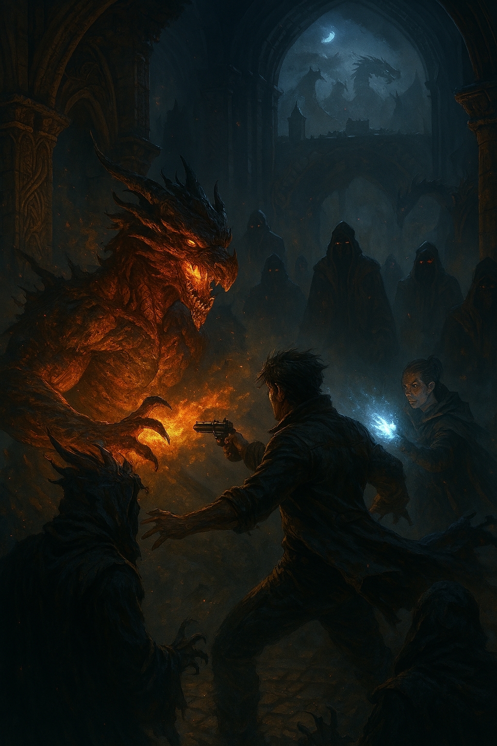 Старик-дракон усмехнулся, и в тот же момент зал взорвался движением. Фигуры рванулись к нам, их когти сверкали, магия гудела, как рой ос. Эйра швырнула заклинание, отбросив одного, но другой был уже рядом, его когти целились мне в грудь. Я выстрелил, пуля вошла в его плечо, но он даже не замедлился. Амулет горел, и я знал — ещё секунда, и я либо выпущу дракона, либо умру.