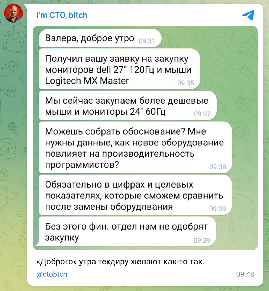1003 imctobitch Норм автор IT-юмор Серия I'm CTO, bitch Обоснуй закупку1 8 месяцев назад 😡 Телеграм-канал [моё] I`m CTO bitch Переписка Скриншот IT юмор Закупки Идиотизм Контроль Деньги Оборудование Программист Эффективный менеджер Бухгалтерия 17 12 5 2 1 Ещё 0